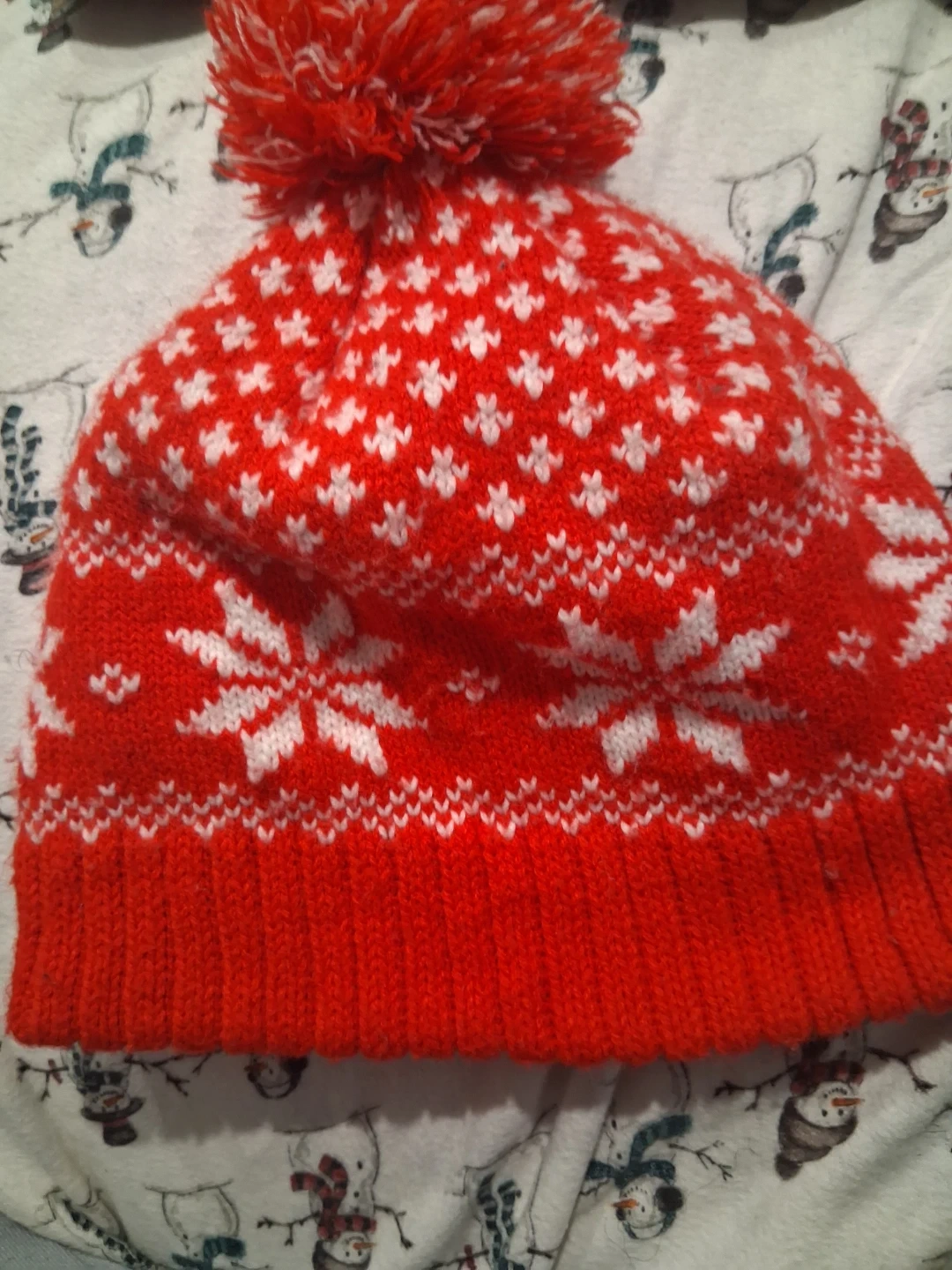 Cozy knitted hat with a festive red and white snowflake pattern. It's topped with a matching pom pom for a classic winter look. Great for staying warm on chilly days!