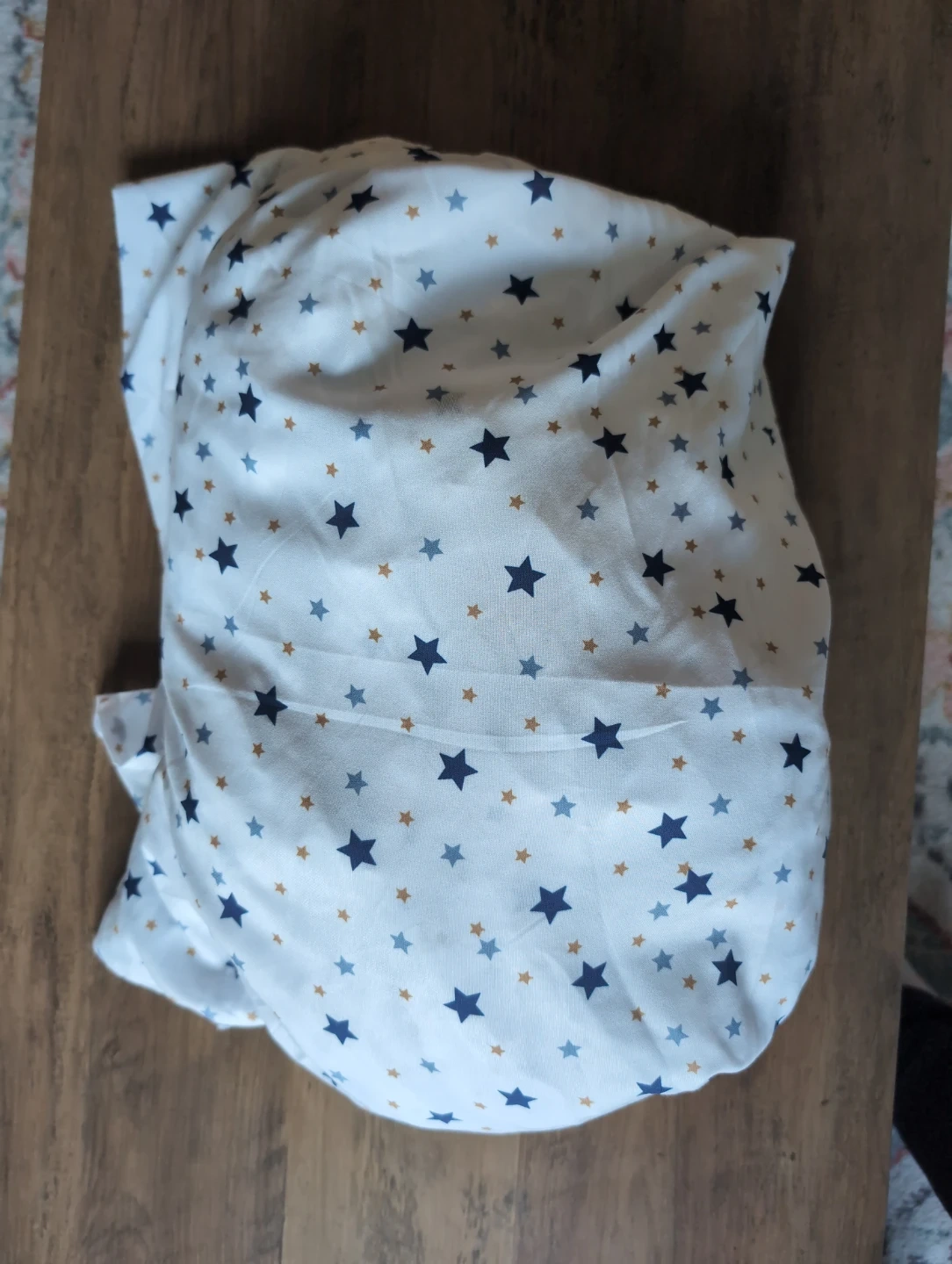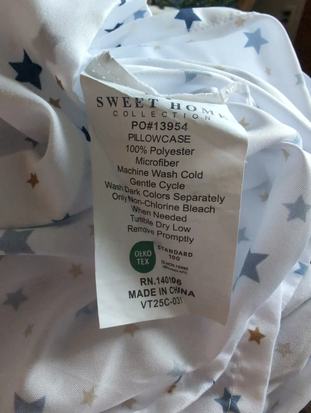 This is a Sweet Home Collection twin sheet set with a pillowcase, flat and fitted sheet. It's made from 100% polyester microfiber. Features a fun star print design. Machine wash cold with gentle cycle. Bought brand new recently and couldn't return it. It's been washed but never used.