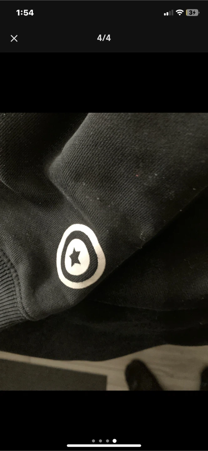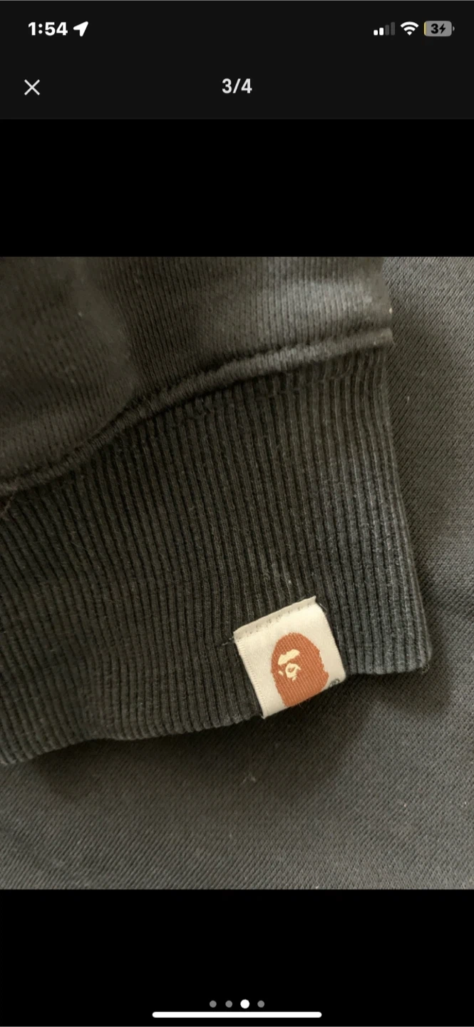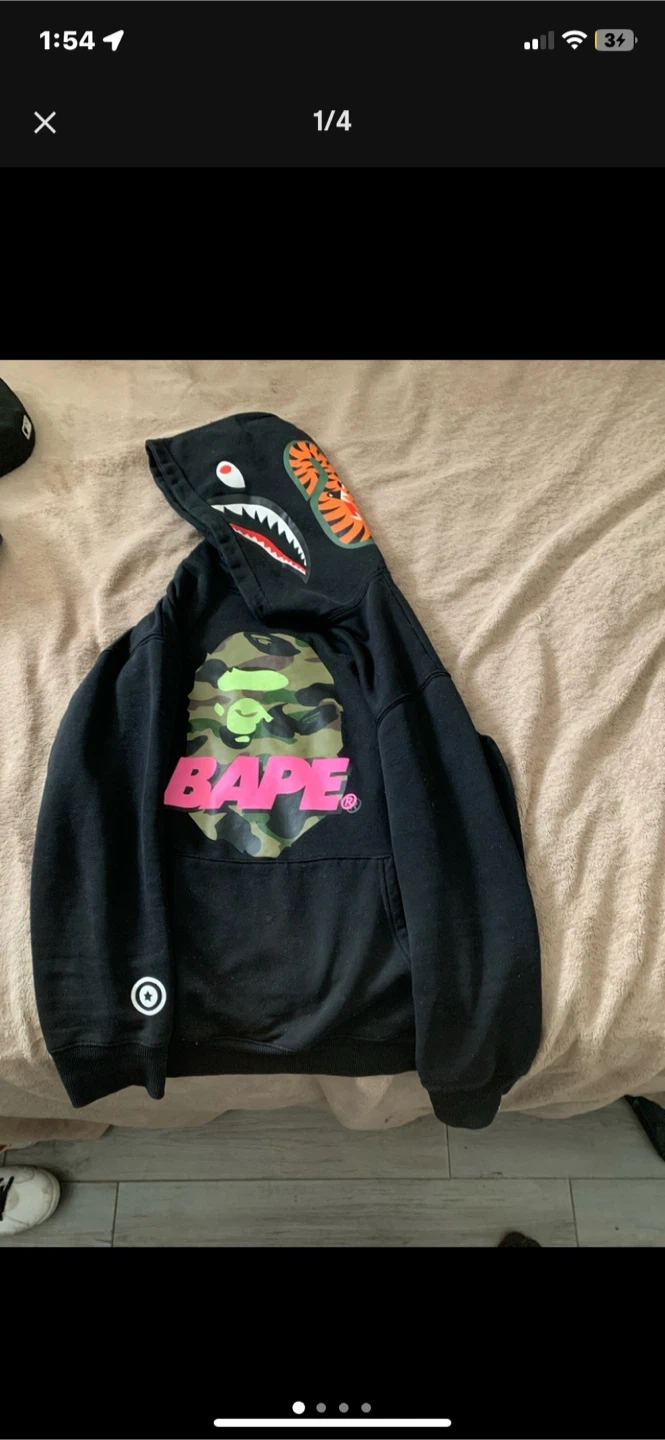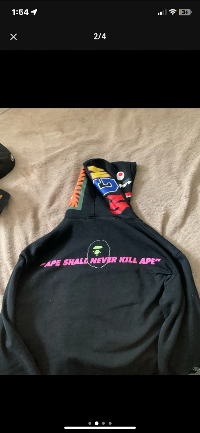 17Selling a BAPE hoodie in black. It features the iconic shark design on the hood and the BAPE logo on the front. There's also a design on the back that says 'APE SHALL NEVER KILL APE'. It's in good condition and a great piece for any BAPE fan