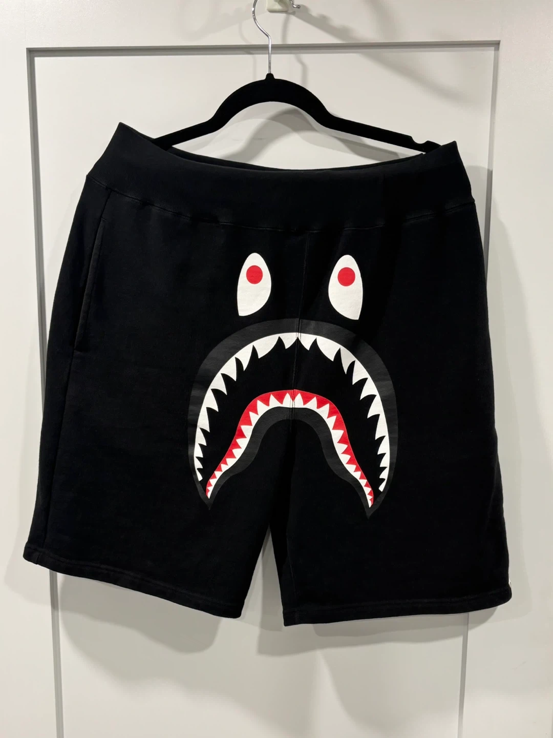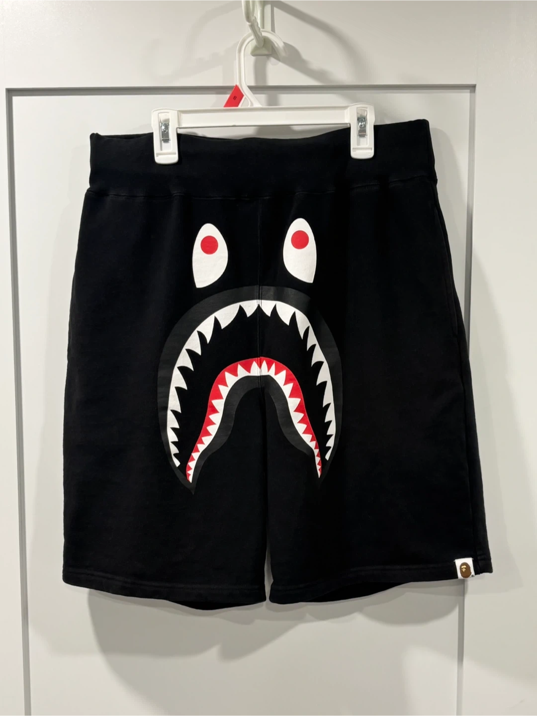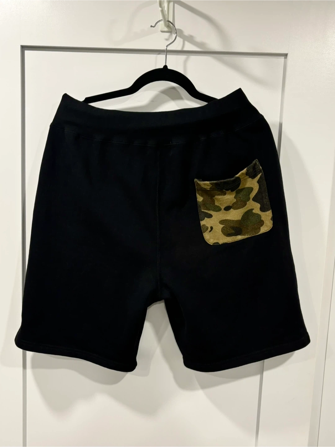 108Clean and in great condition . A Bathing Ape or Bape black shorts in size L. These shorts feature a cool shark design and a camo back pocket. Note it is a firm waist band but do not have the drawstring .
