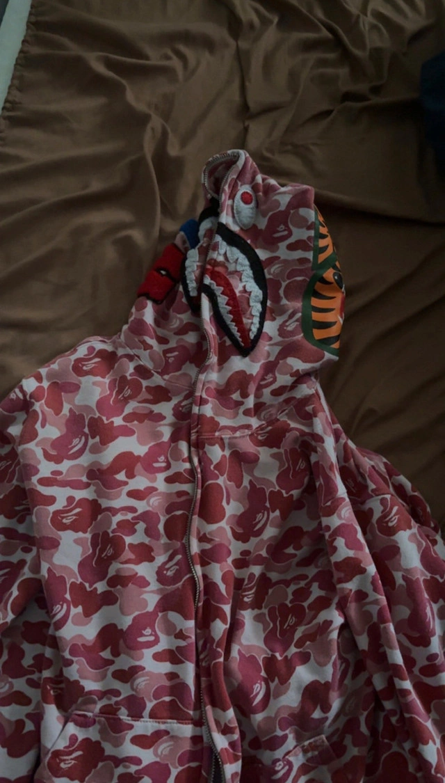 10This is a Bape hoodie featuring a distinctive pink camo pattern and the iconic shark design on the hood, perfect for streetwear enthusiasts. Given its condition, it's a stylish addition to any wardrobe. * Size: Large (womens) * Colour: Pink Camo. Let me know if you're interested!