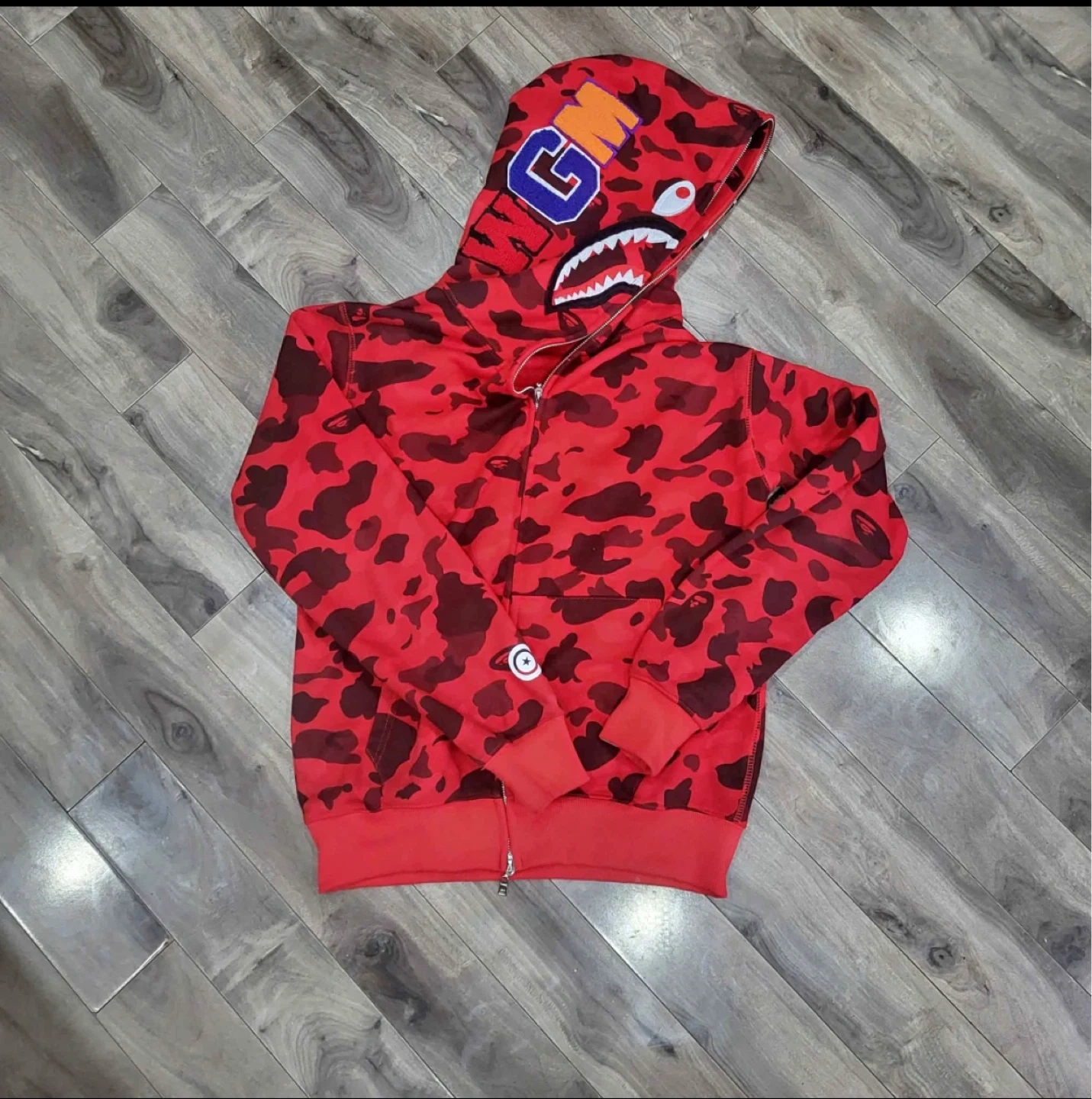 10Selling a AUTHENTIC ✅BAPE (A Bathing Ape) full zip hoodie in a striking red camo pattern. This hoodie features the iconic shark design on the hood. A stylish and eye-catching piece for any streetwear enthusiast!