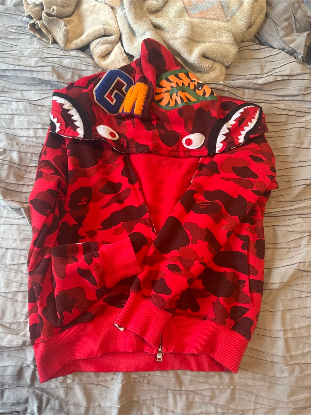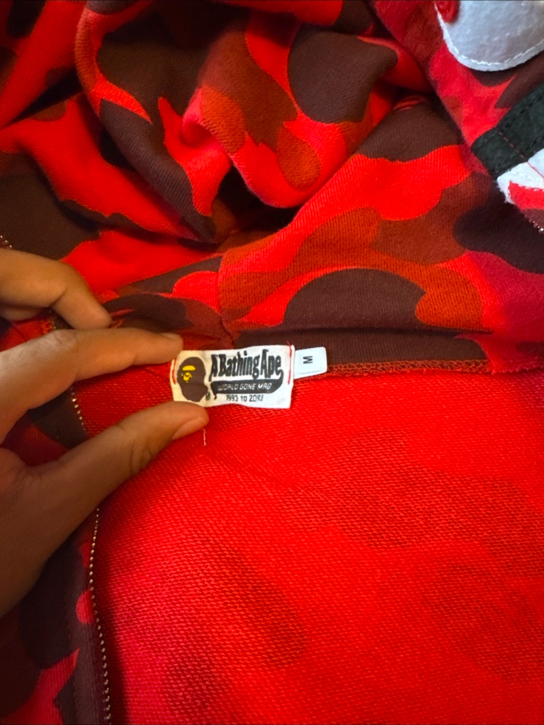 Selling a Bathing Ape (BAPE) shark hoodie in a red camo pattern! It's a size medium. The iconic shark design on the hood makes it a standout piece. Perfect for adding some streetwear style to your wardrobe! Size is medium but better fit in small.