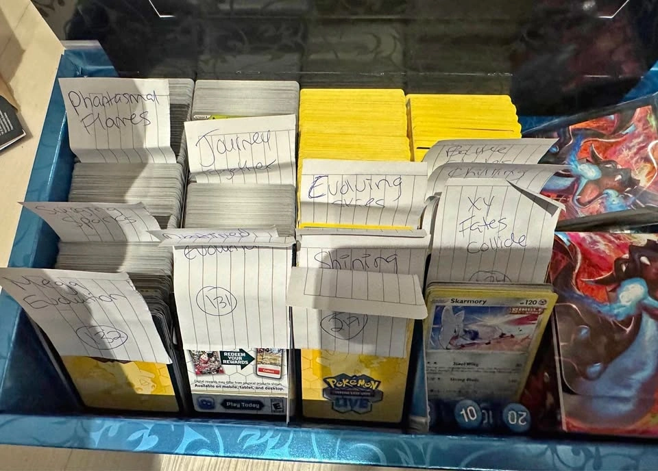 Cash only. Sorted bulk Pokémon cards. Comes in the Charizard box and includes new sleeves, deck box and dice.