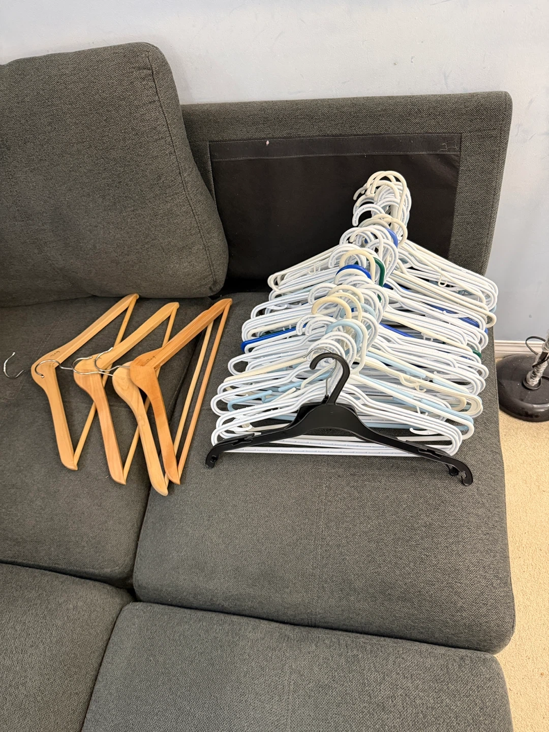 Bundle of wooden and plastic clothes hangers. Includes various colours and styles for organizing your closet. Plastic hangers are mostly white and blue, with some cream-coloured ones. Wooden hangers are natural wood finish. 60 hangers.
