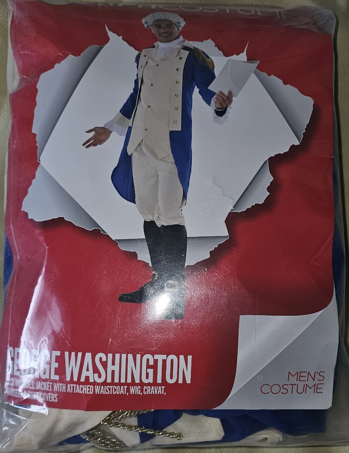 Selling a George Washington men's costume. It includes the jacket with attached waistcoat, wig, cravat, trousers, and boot covers
