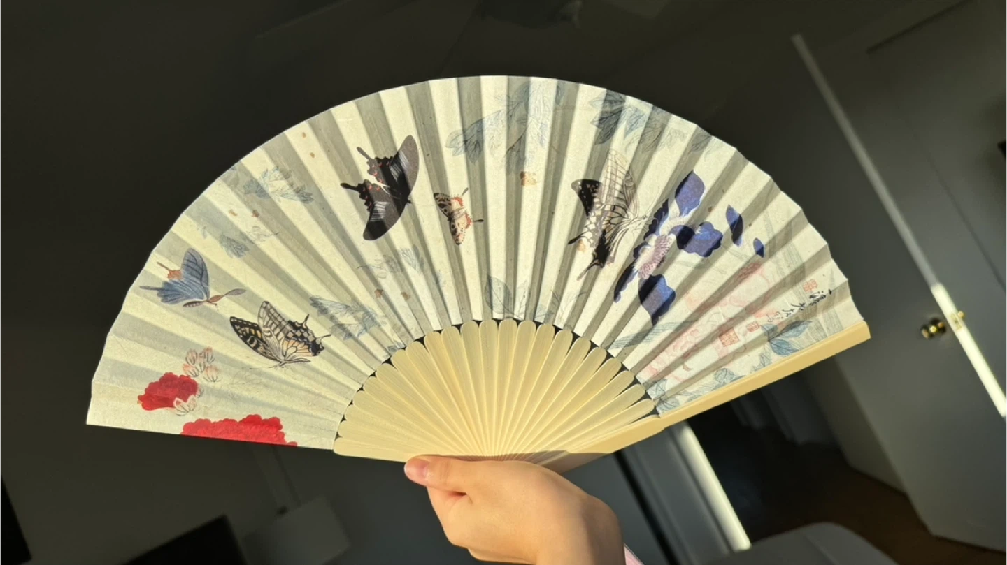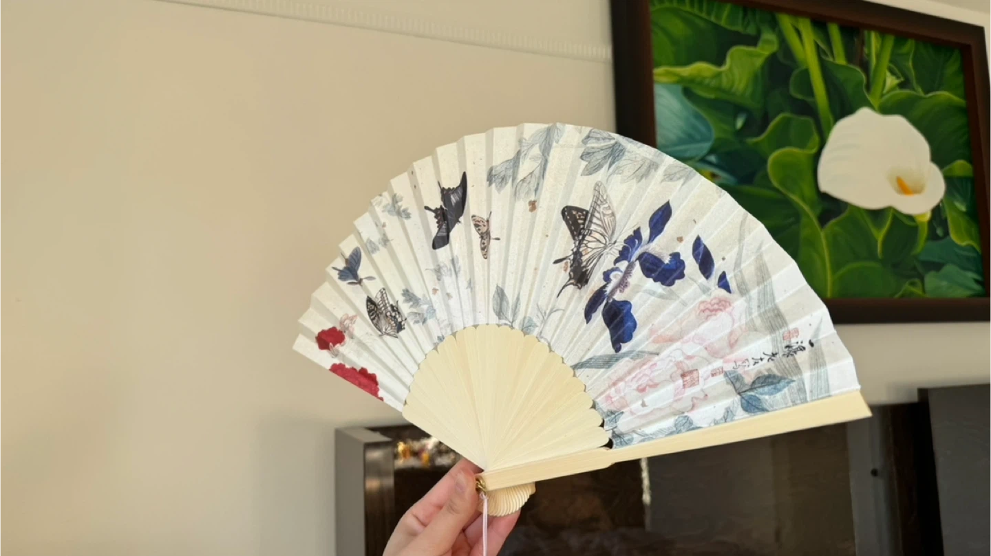 This folding fan features a beautiful butterfly and flower design. It comes with a pink tassel and is housed in a grey gift box from the National Museum of Korea. It's a lovely accessory for warm weather!