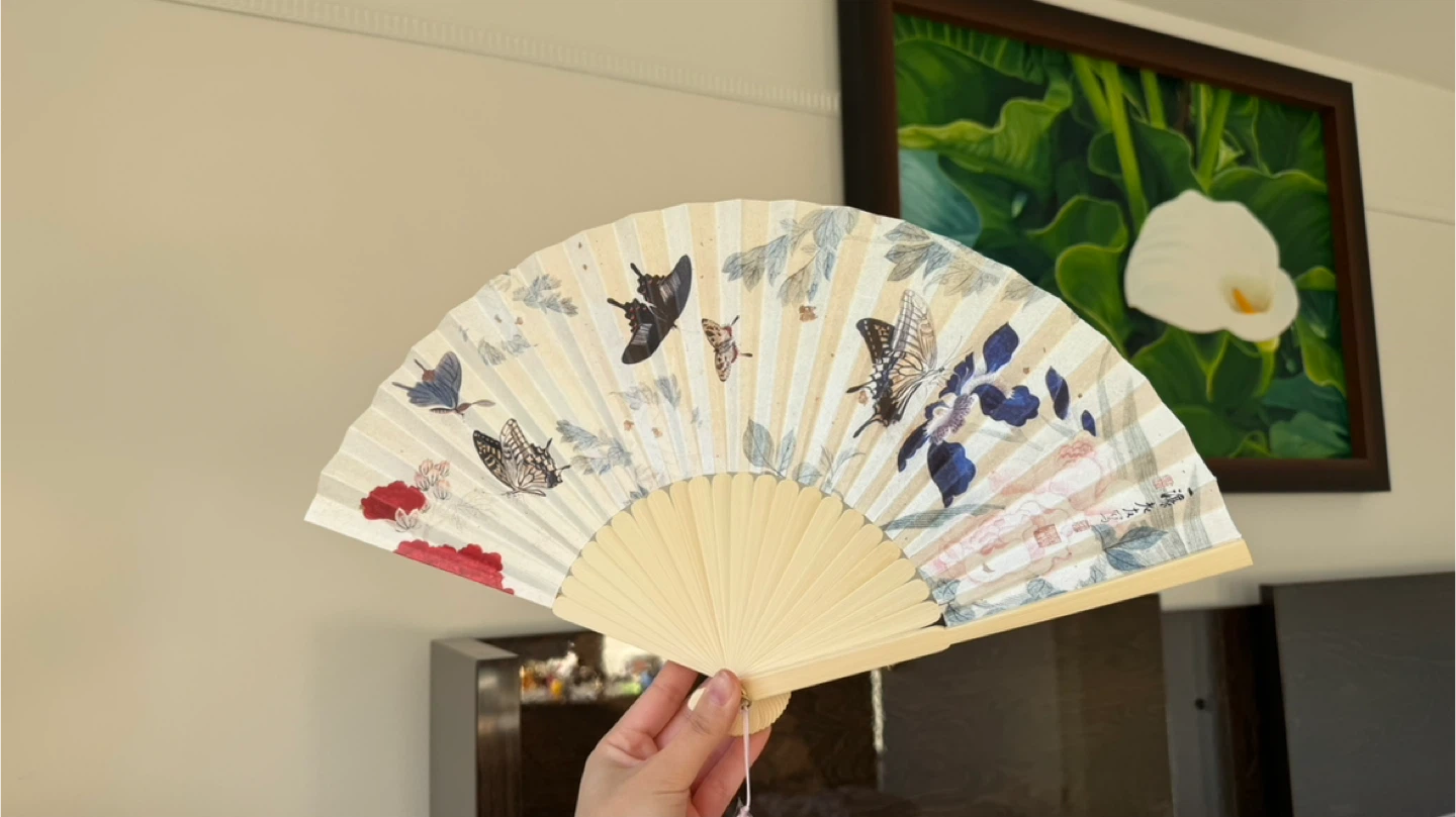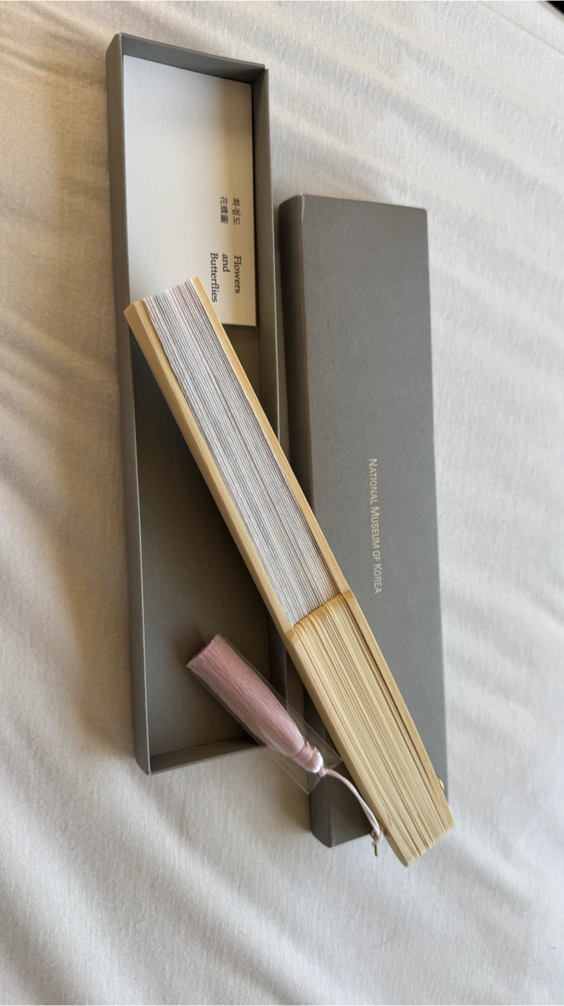 This folding fan features a beautiful butterfly and flower design. It comes with a pink tassel and is housed in a grey gift box from the National Museum of Korea. It's a lovely accessory for warm weather!