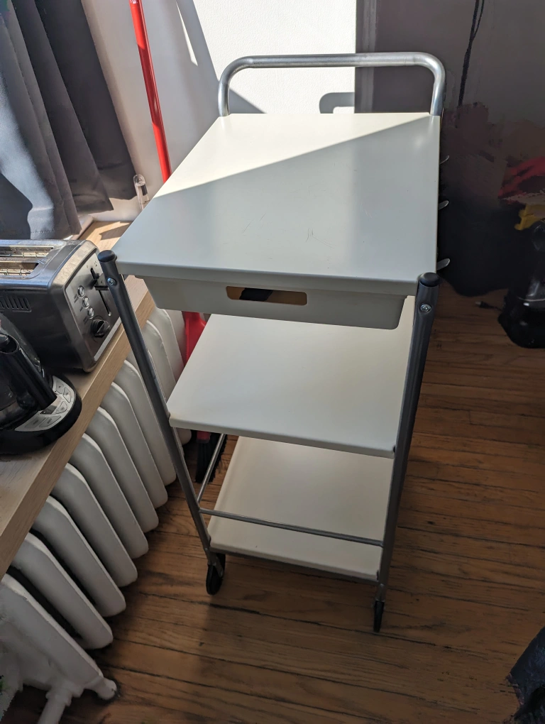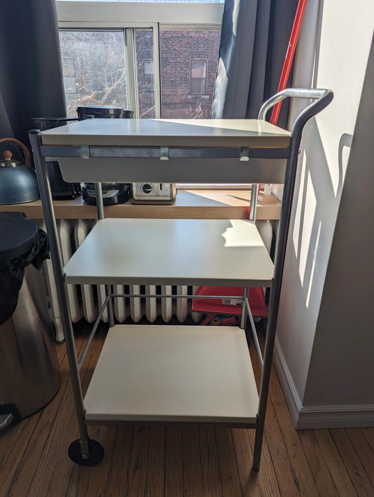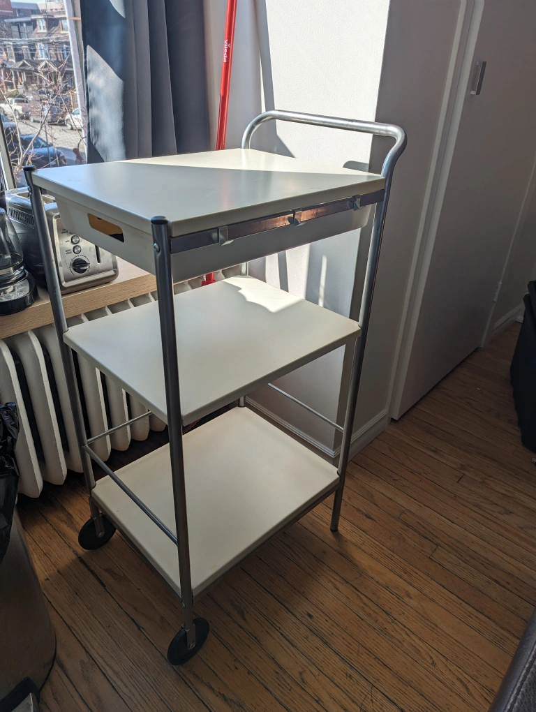 Selling this very practical, 3 tiered kitchen cart. I used this as a bar cart but it can serve multiple purposes. Clean and in very good condition. Only selling it because I moved and don't have a spot for it in my new apartment. Measurements in the pictures, but it's small enough to fit in any car. Pickup on Roncy. Cash only.