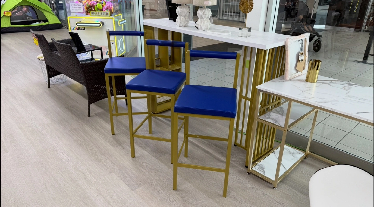 Set of 4 - Pub Table + 3 Pub stools featuring a gold frame and blue seats. Great for adding a pop of colour to your kitchen or bar area! Table size: 63” x 20” x 42” height Limited quantity