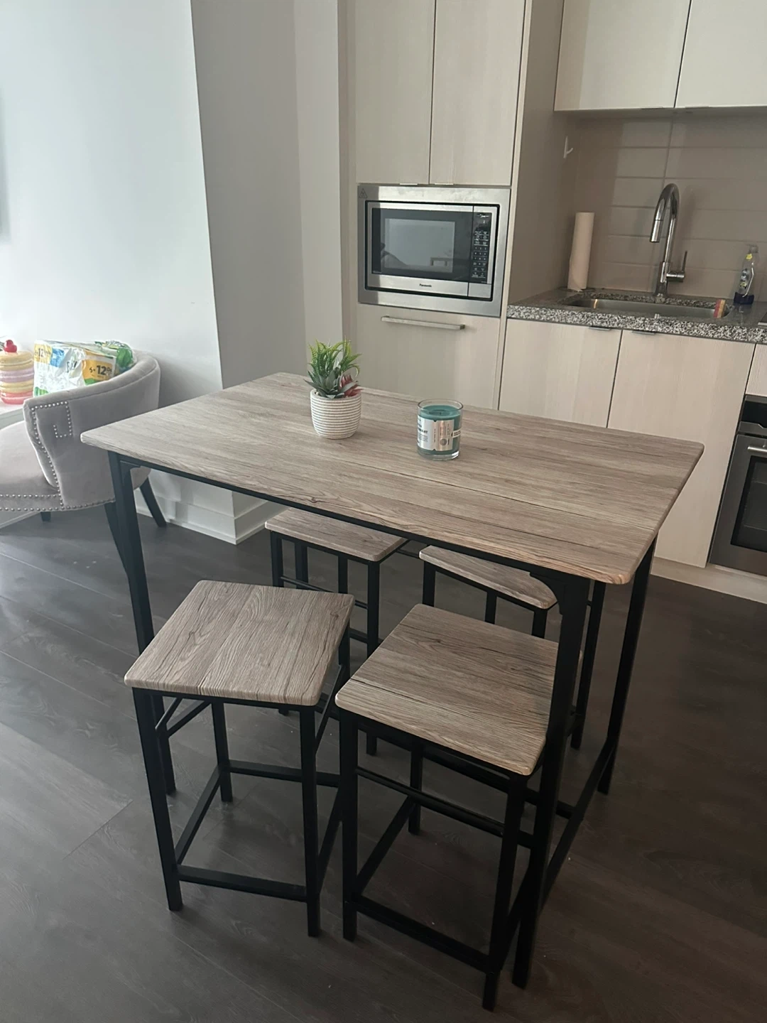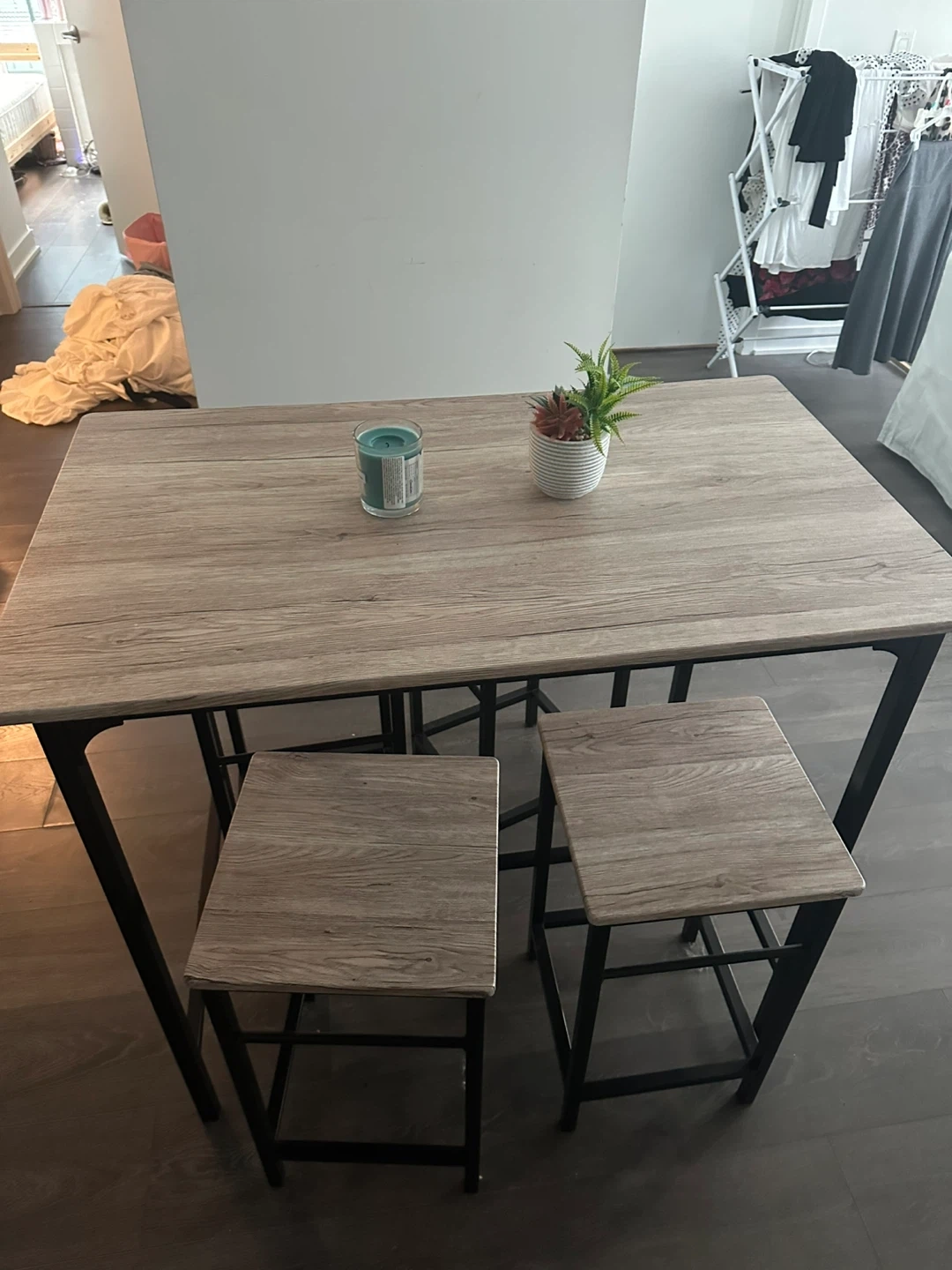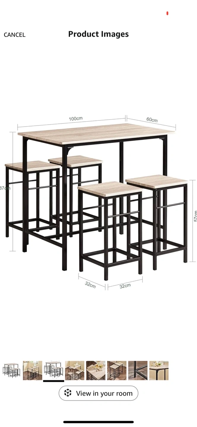 Selling a bar table set, which includes a table and four stools. This set is perfect for a kitchen breakfast table or a home kitchen counter. The table dimensions are 100cm x 60cm, and the stools are 32cm x 32cm. The stool height is 57cm and the table height is 87cm. It’s a great set for smaller spaces! Perfect for outside or for inside.