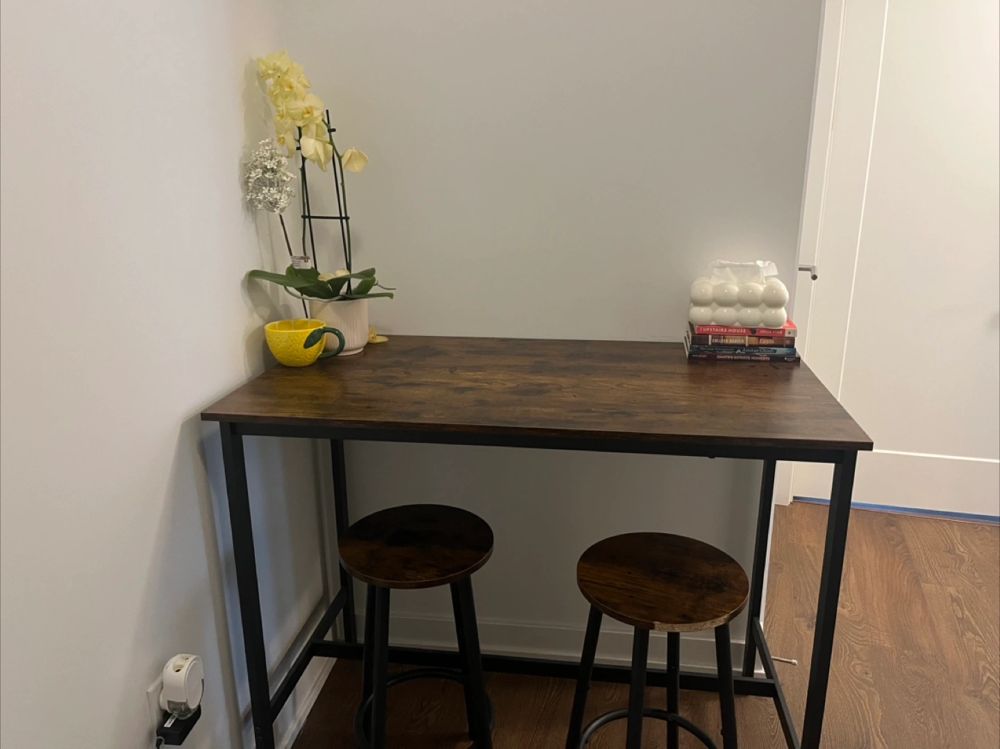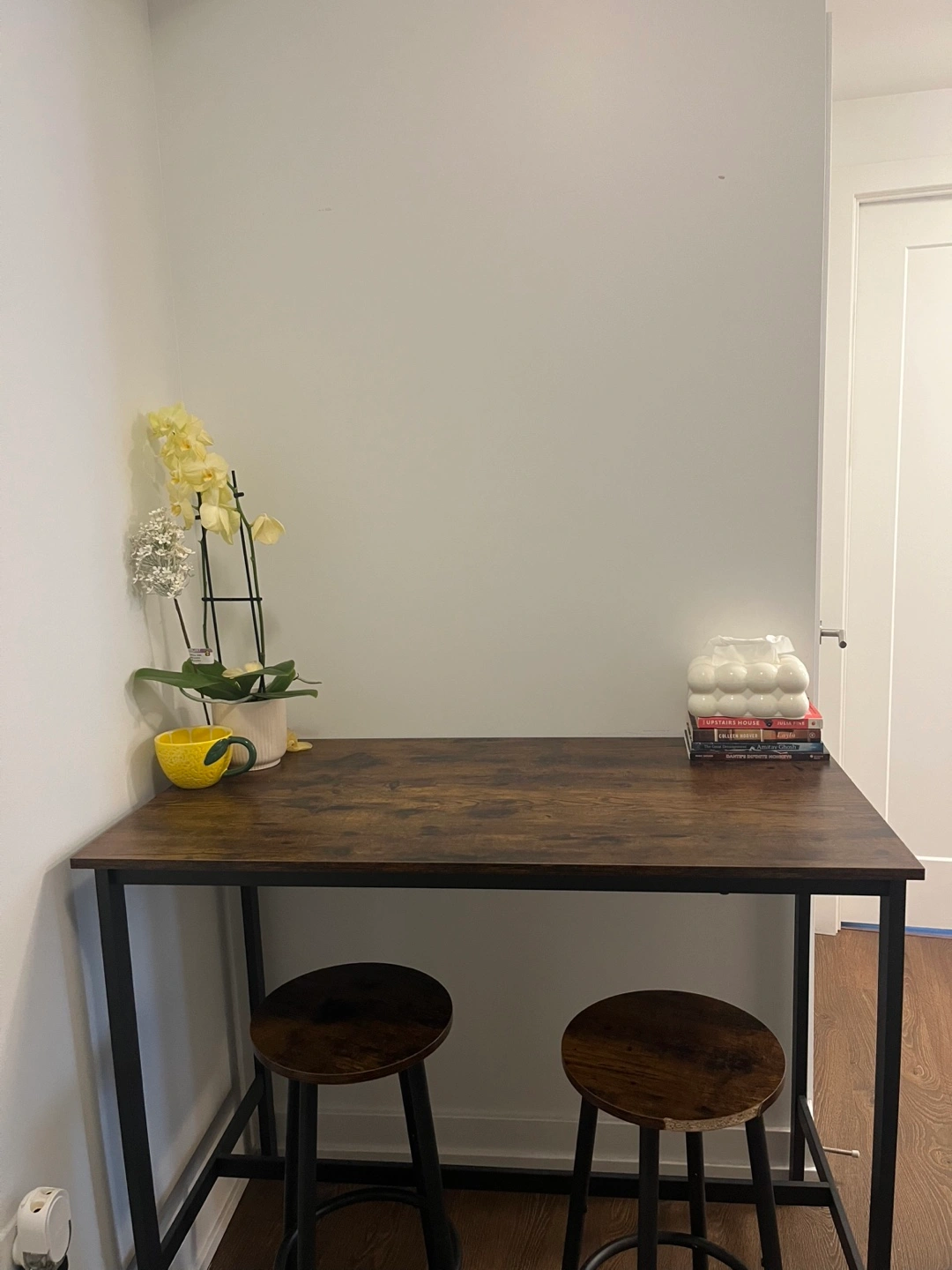 Selling a bar table with four matching stools. The table has a dark brown wooden top and black metal legs. The stools are also dark brown wood with black metal legs. It's a great set for a small space!