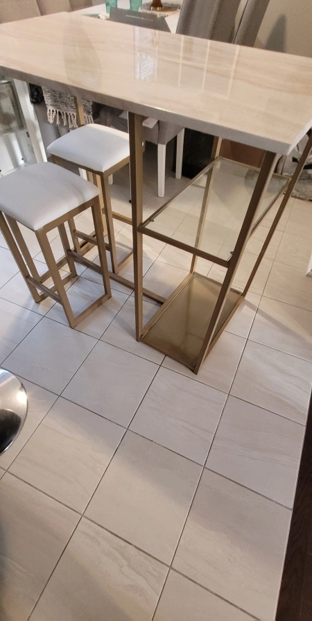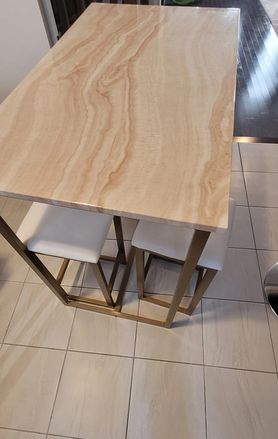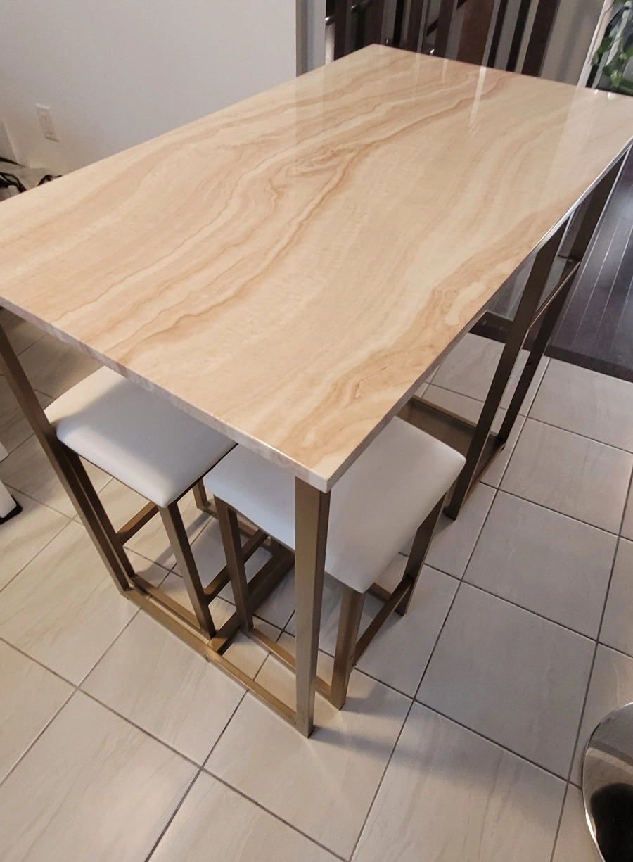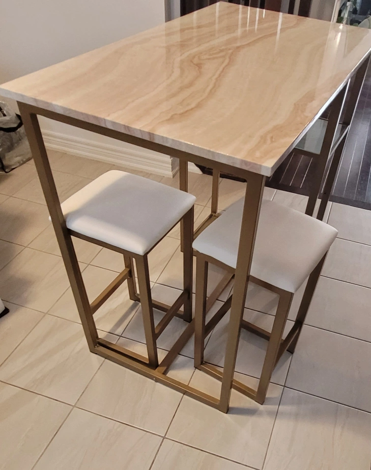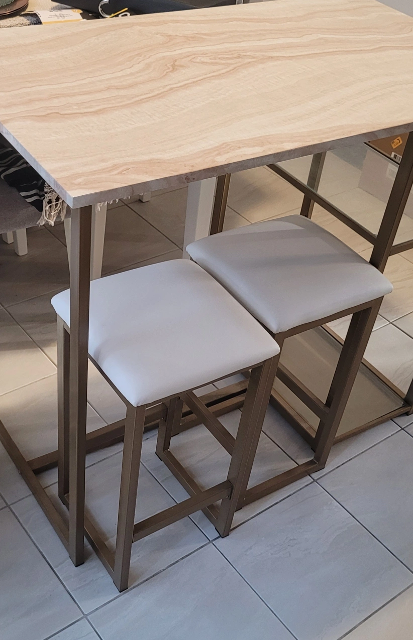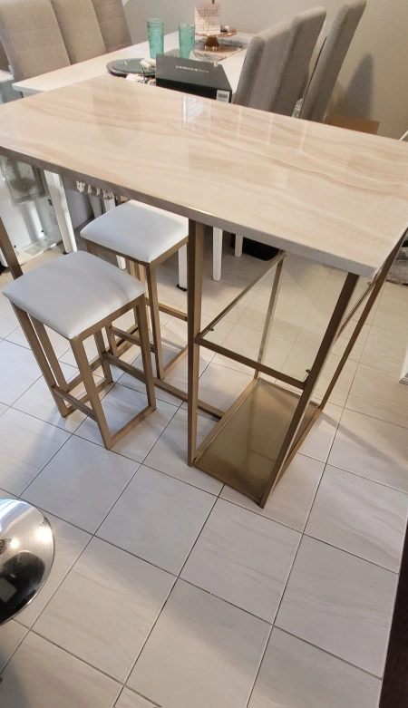 20Gold bar table with marble countertop. Includes two white upholstered stools. Has 3 glass shelves Beautiful (goldish/copper) bar height table Two bar stools included Not pictured is a 3rd mirror shelf that can be added or removed. This will be included Table: 42" W x 24" D x 36" H Chairs: 22"H x 12" D x 12" W