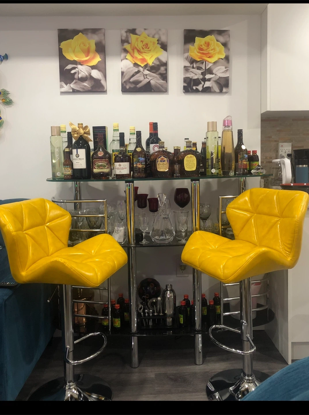 18Selling a set of two stylish bar stools and bar The stools feature a bright yellow colour and a modern design. Perfect for adding a pop of colour to your kitchen or bar area. They appear to be in good condition and ready for a new home.