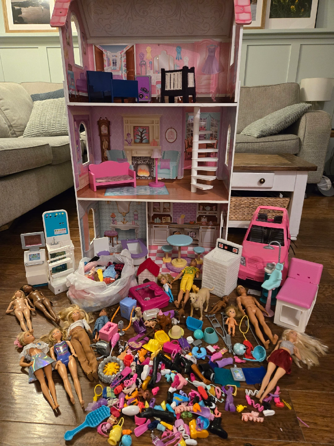 15Selling a large dollhouse that comes with lots of furniture and dolls! It's in great shape and ready for a new home. Includes a variety of accessories like a pink car, kitchen appliances, and tons of doll clothes. Perfect for hours of imaginative play. Roof has one screw missing, does not affect the use of the house. located in Copperfield.