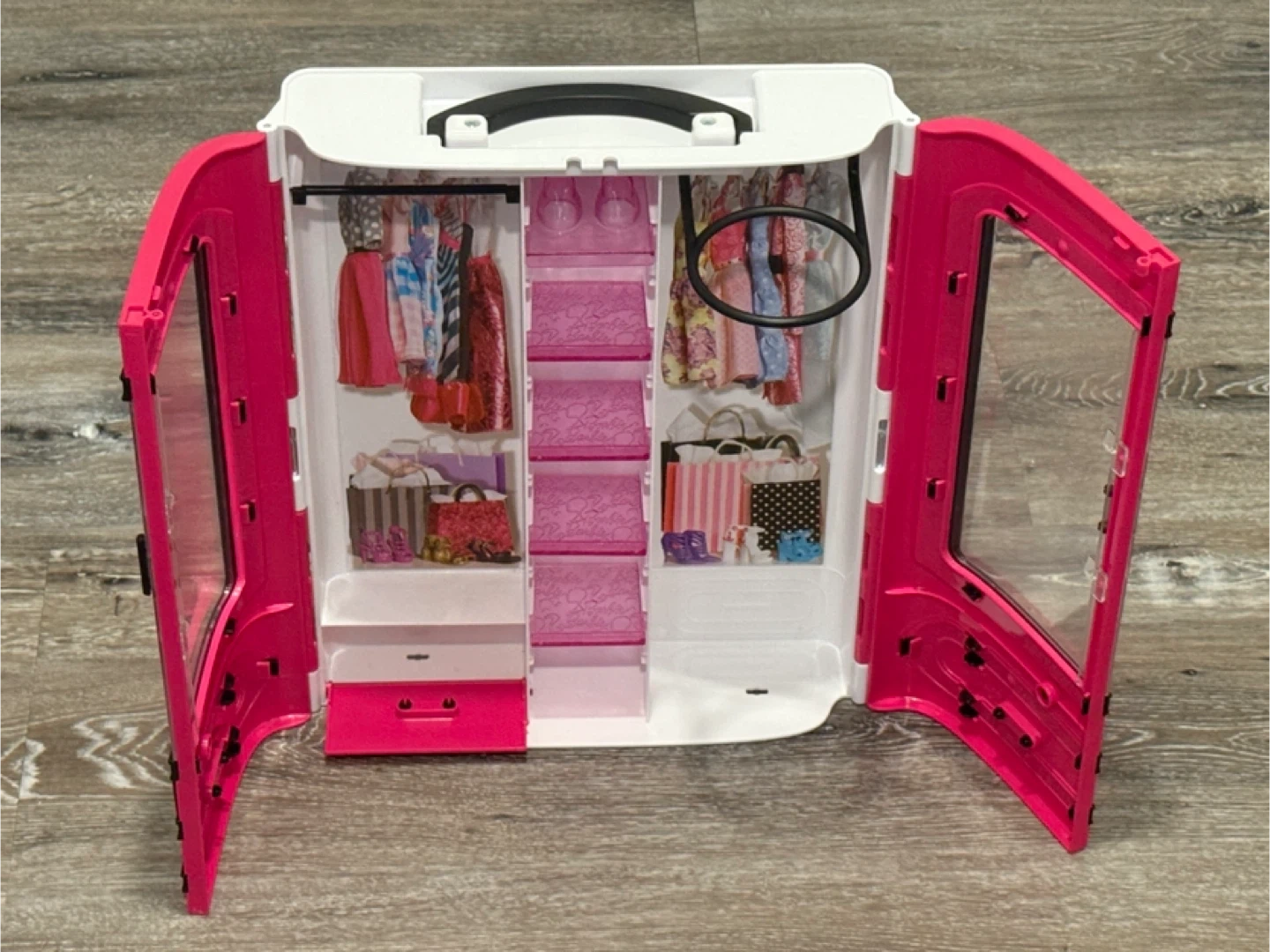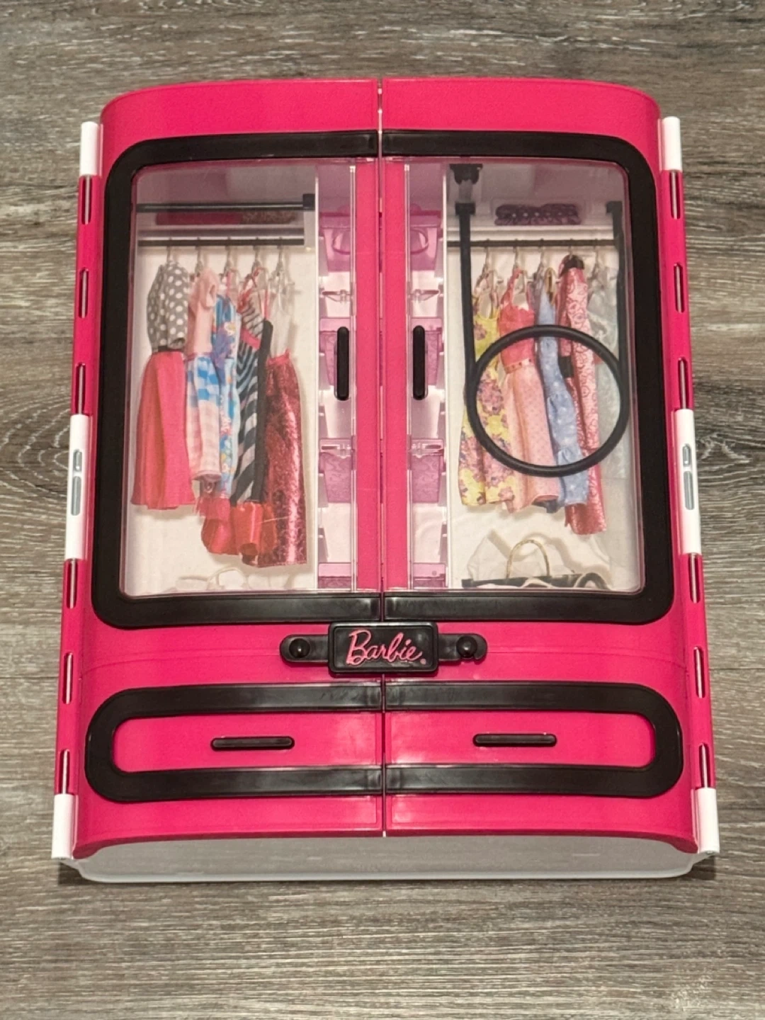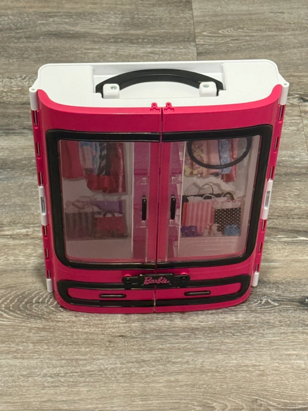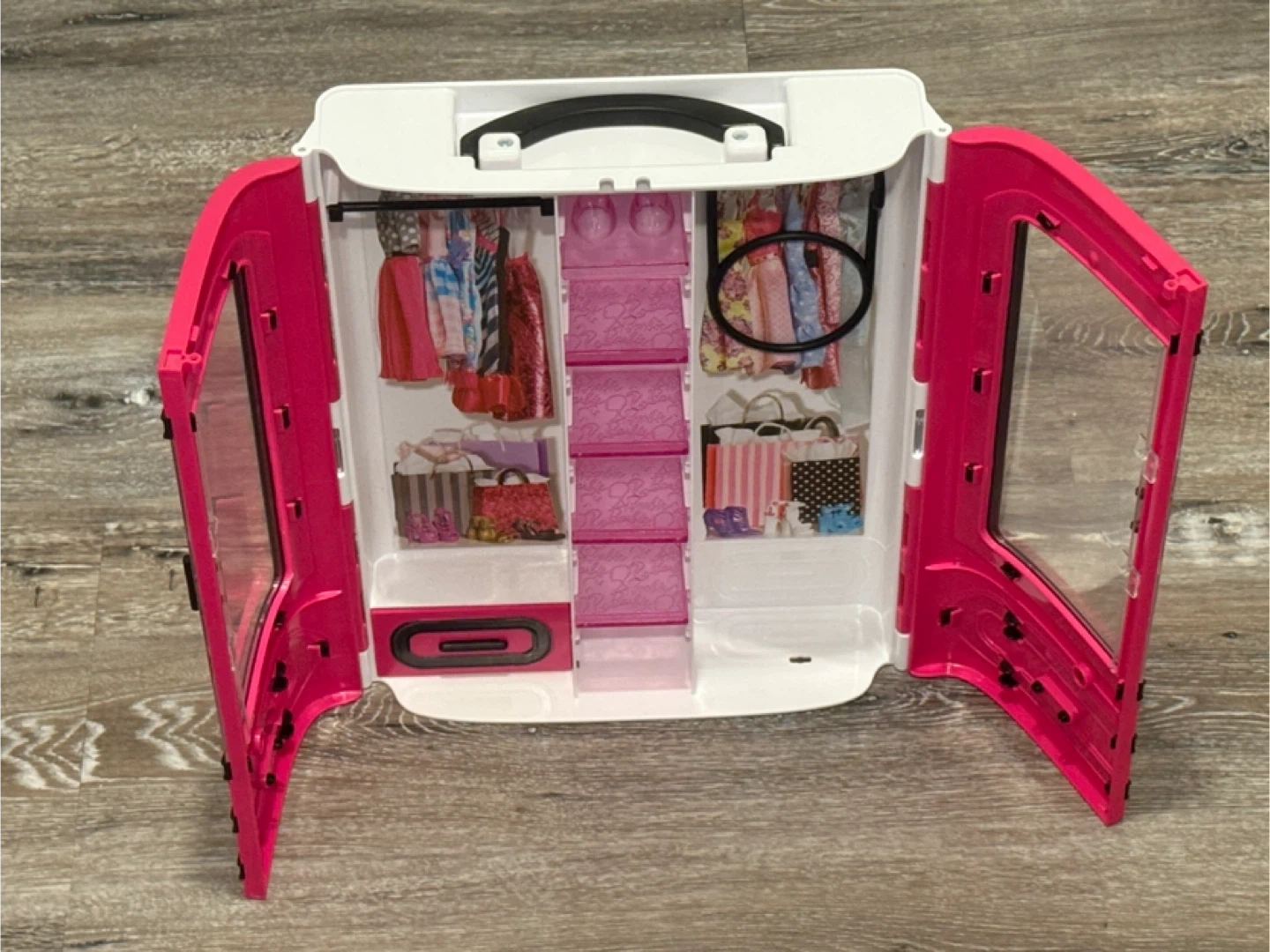 Selling a Barbie closet in great condition! It's pink and white with a black handle. The closet has clear doors and shelves, and drawers to organize Barbie's outfits and accessories Pick up Sage Hill Smoke and Pet Free Home If ad is up this is available Cash only please Please take a look at my other listings Thank you