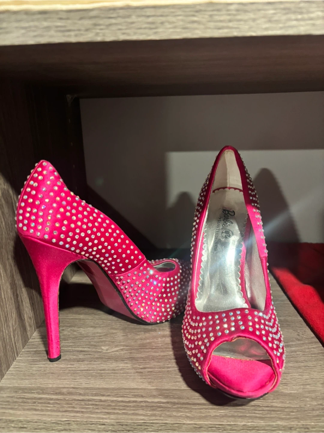10These Bearbie heels are a vibrant pink and covered in rhinestones, perfect for adding some sparkle to your outfit! They're a size 8 and in great condition
