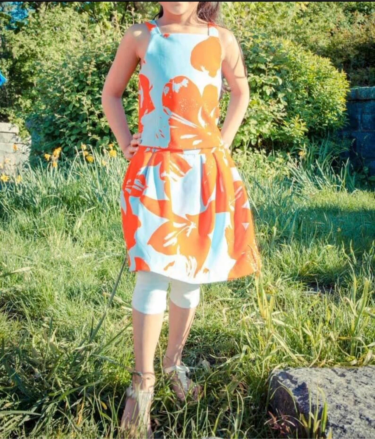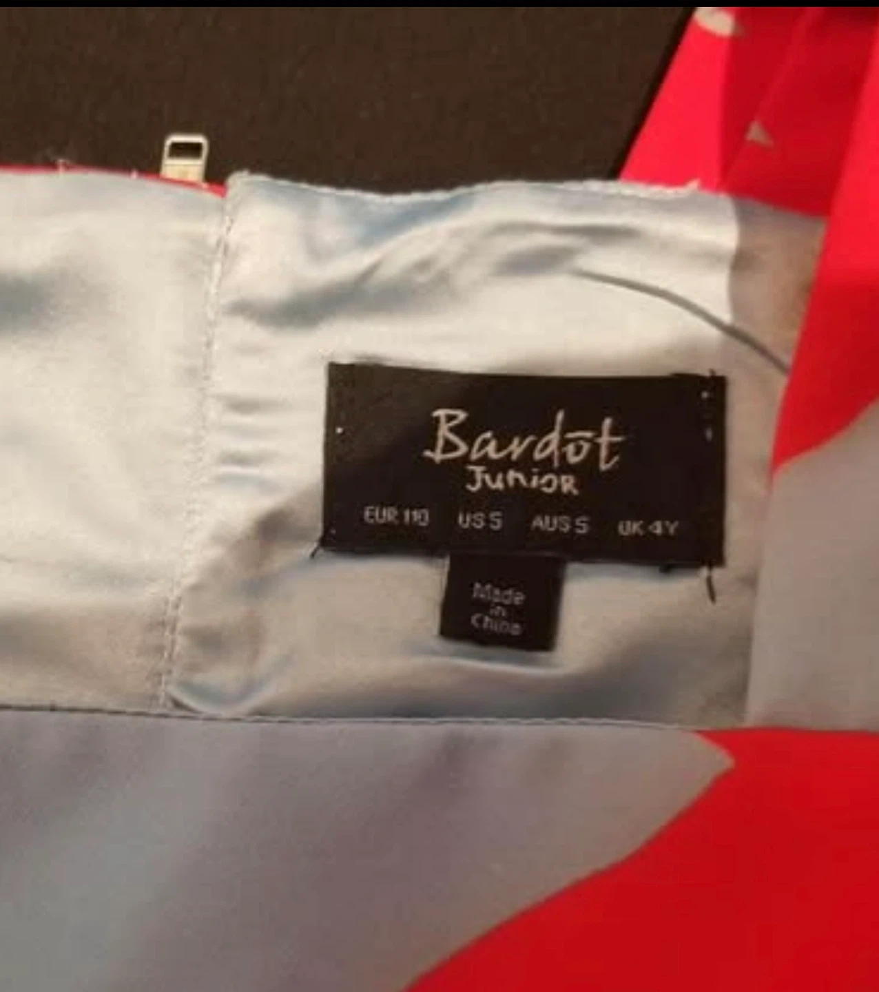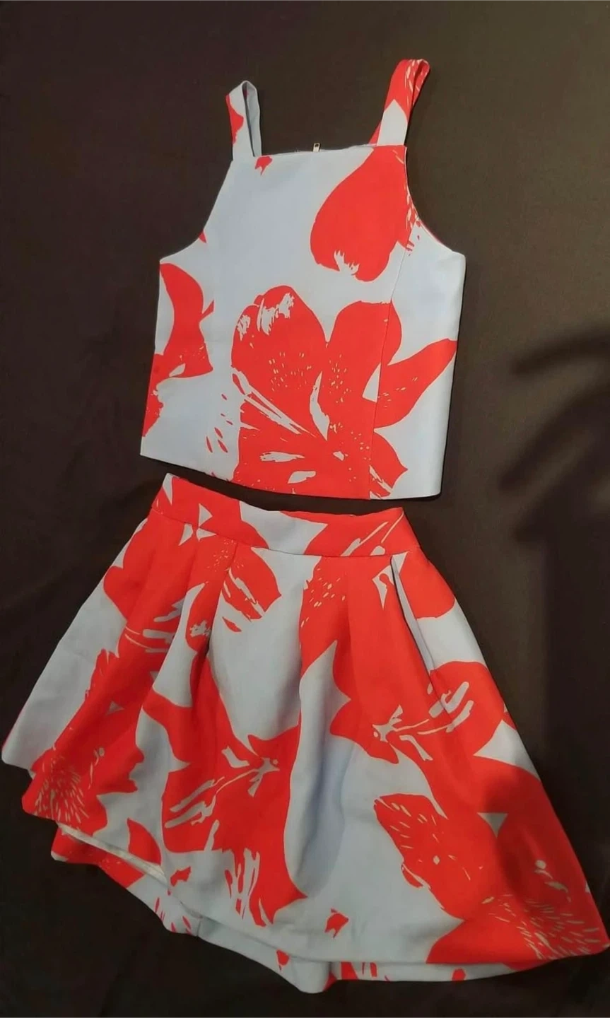 10A cute designer Bardot Junior two-piece set for girls! The set features a floral pattern in red and white. The size is US 5. Perfect for a sunny day!
