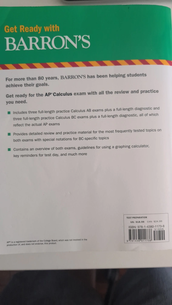 Selling a Barron's AP Calculus book, fifteenth edition! It includes 8 practice tests and is designed to help you get ready for the AP Calculus exam. The book provides comprehensive content review for 2020 & 2021 tests and includes practice material for tested topics.