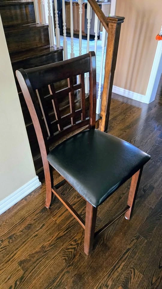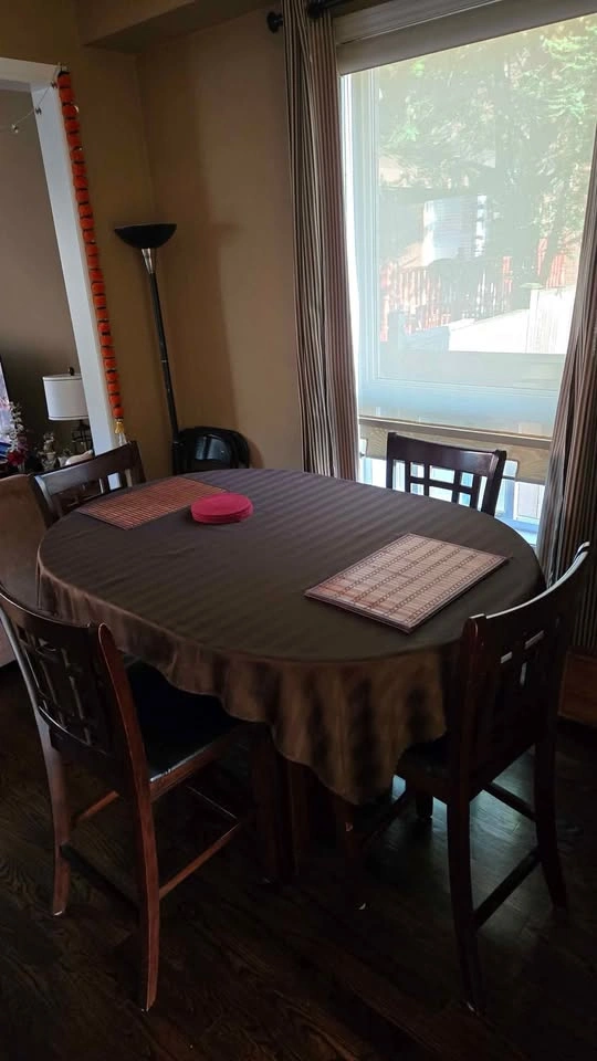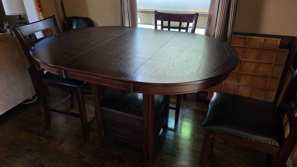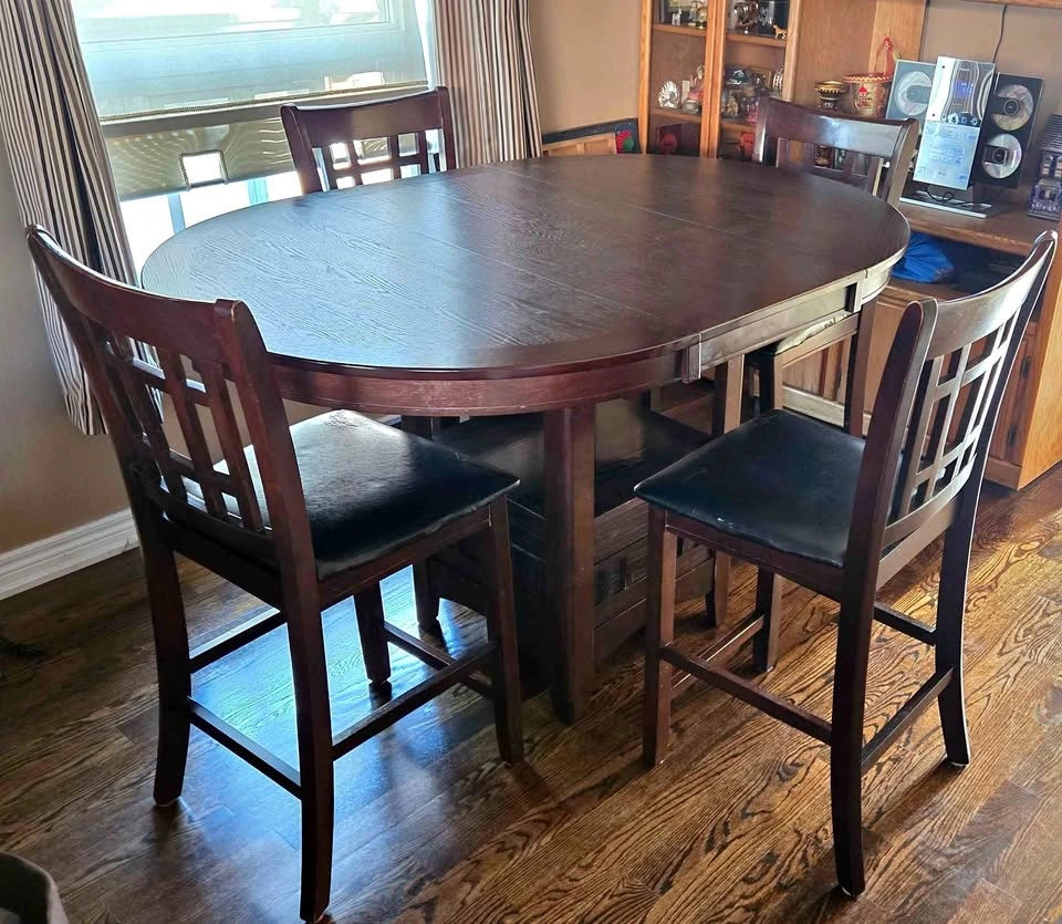 62Dining table is expandable and can compress for smaller spaces. In Mint condition as we kept a table cloth on the entire time of use. 4 High Stool Chairs Included. All useable. 2 of the chairs' legs need some extra tightening.