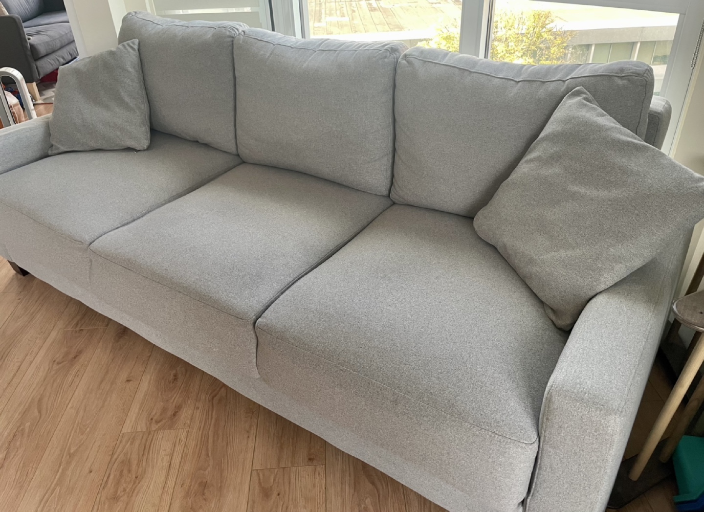 15Purchased pre-covid for international family visitors - which never happened. Now, two kids later, we need more space. Light grey sofa bed has been covered with waterproof sofa cover (not included in sale) since purchase. Fabric, including matching cushions, is near perfect with no stains, wear or tears. Small marks on legs (pictured) Non-smoking, no pets household. Very easy to convert from sofa to queen bed. Great storage under seats for bedding. https://futonland.com/product/barletta-cozy-granite-full-back-sofabed Pick up only, Fairview. (No stairs, elevator and wheelchair access to building)