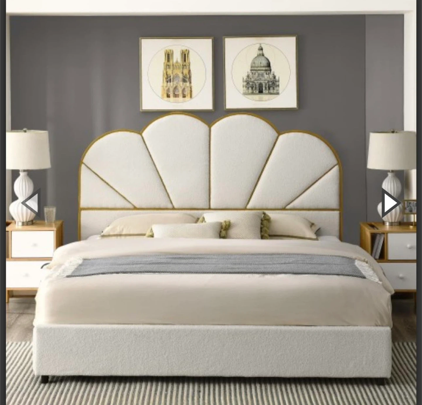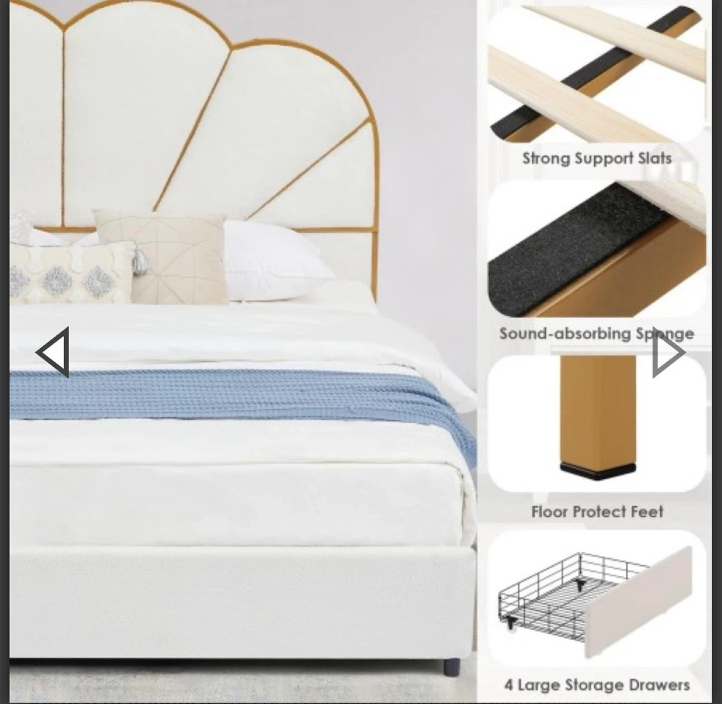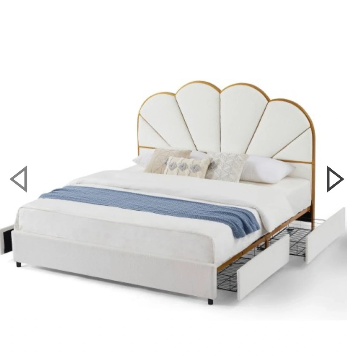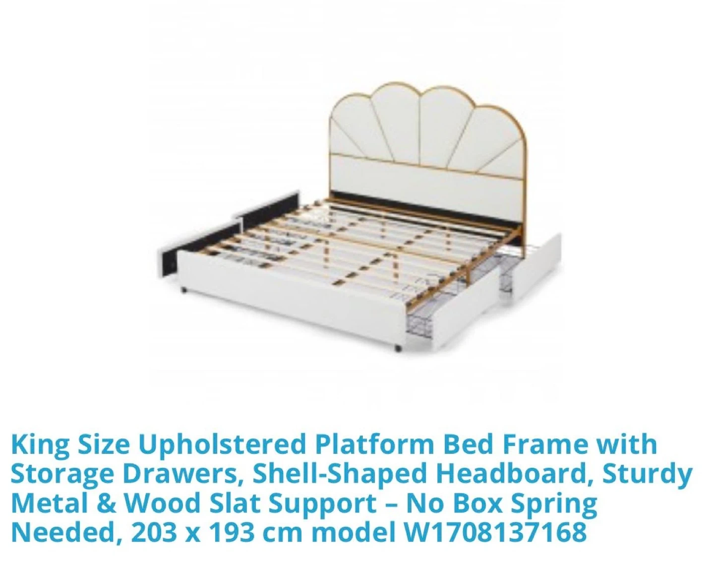 65Talla: King Material: Metal Dimensiones del producto: 82"l. x 78,5"an. x 56,5"al. pulgadas Estilo: Moderno Color: Crema Elegante cama de plataforma con diseño de concha. Amplio almacenamiento: cuatro grandes cajones de almacenamiento debajo de la cama ofrecen un amplio espacio Fácil montaje: todas las piezas, herramientas e instrucciones de montaje están incluidas, con cada pieza. El sencillo proceso de instalación hace que el montaje sea muy fácil. (Nota: no se incluyen almohadas, edredones, colchones, etc.)