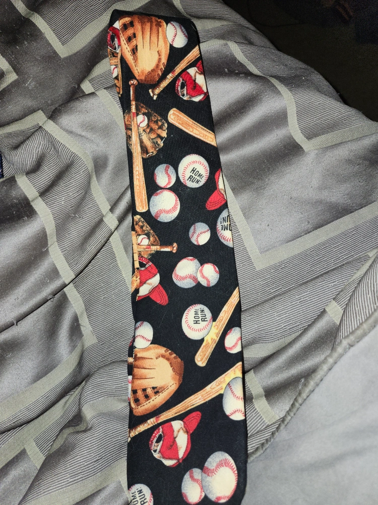 Here's a fun necktie with a baseball theme! It has a black background with baseballs, bats, gloves, and caps printed on it. Perfect for any baseball fan!