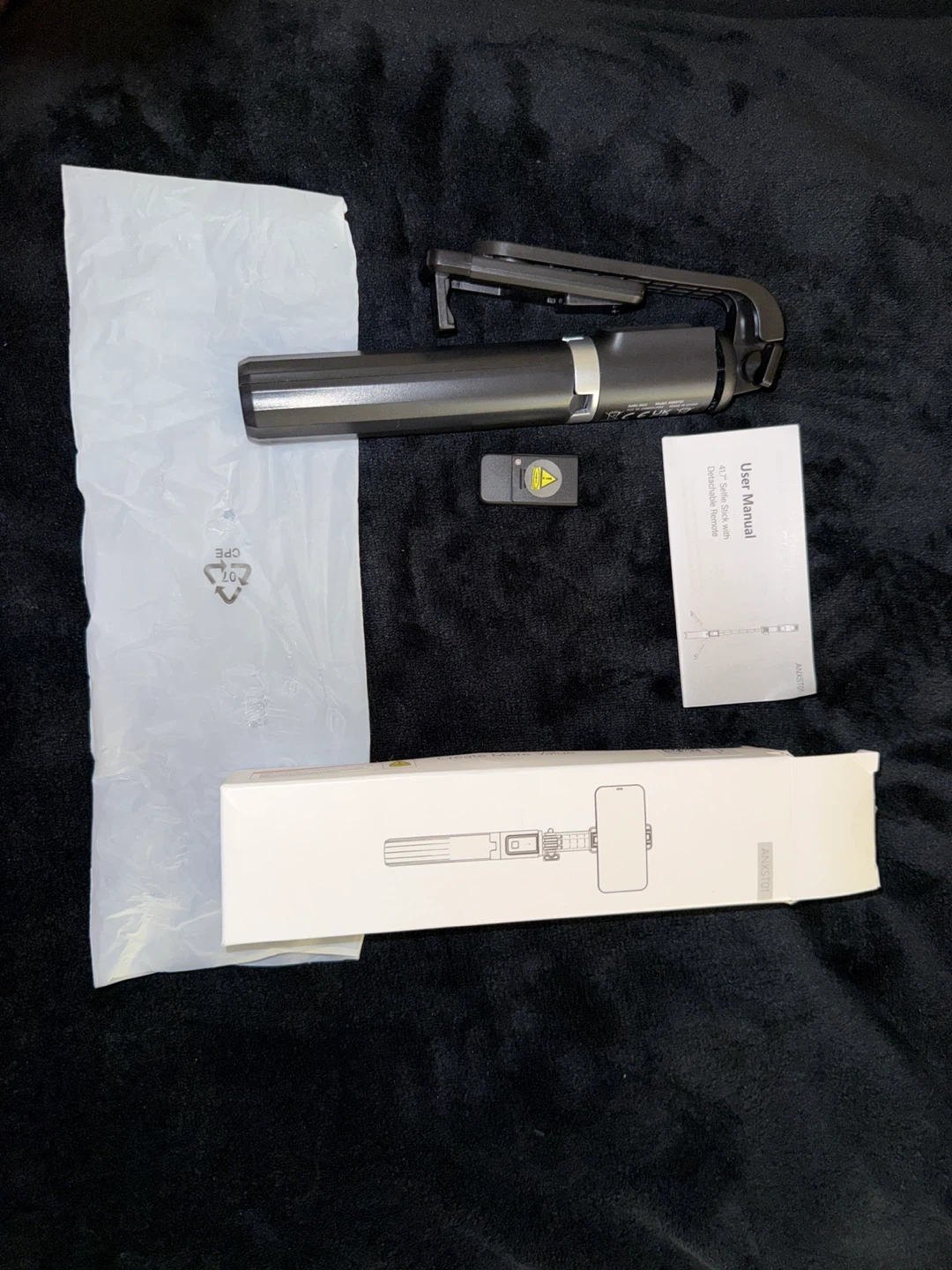 This is a Baseus selfie stick tripod in black. It comes with the user manual, Bluetooth and the box. It is lightweight and portable, perfect for taking photos on the go. It has never been used, I accidentally ordered selfie stick instead of a tripod. It’s brand new. ♡