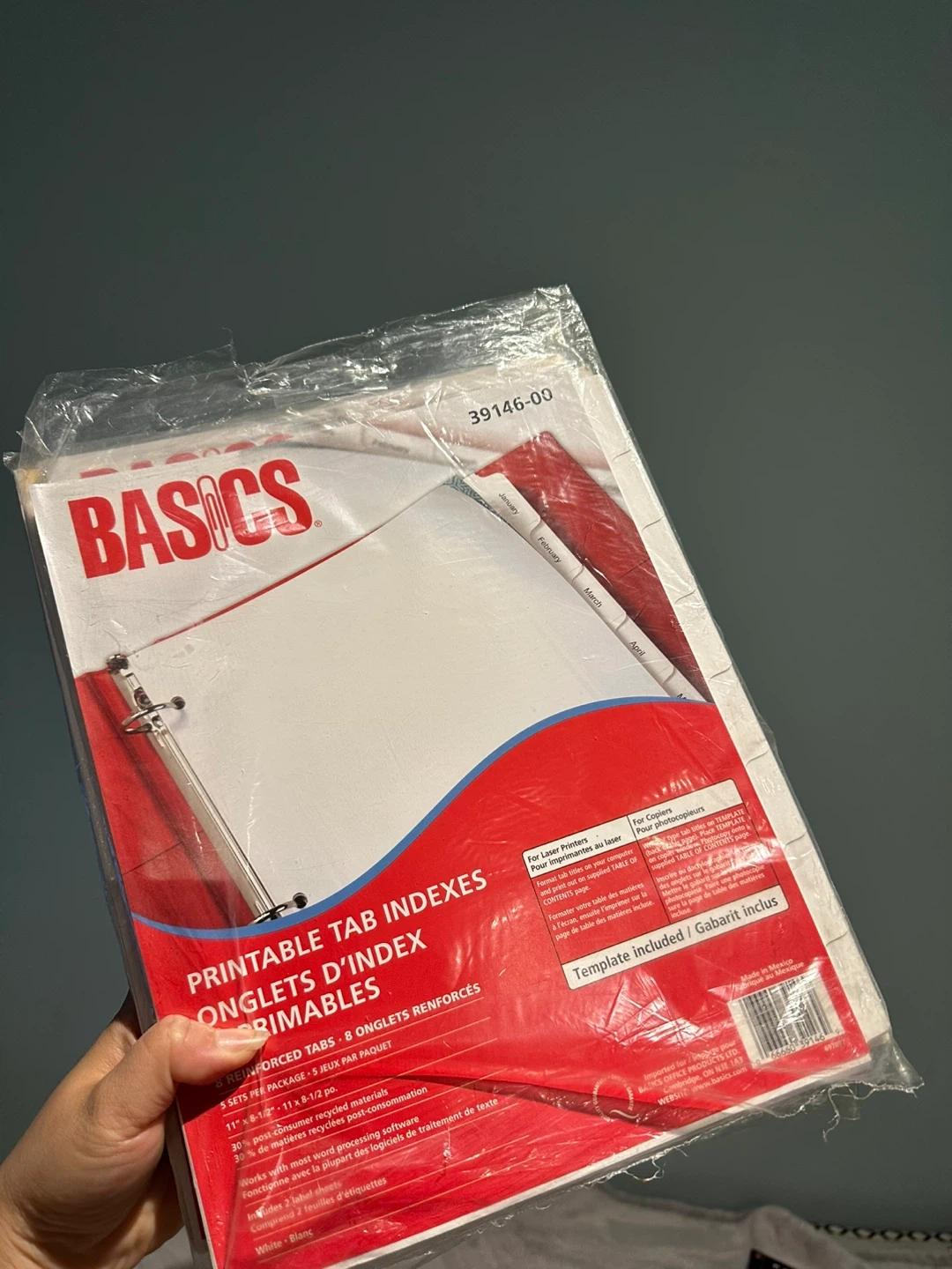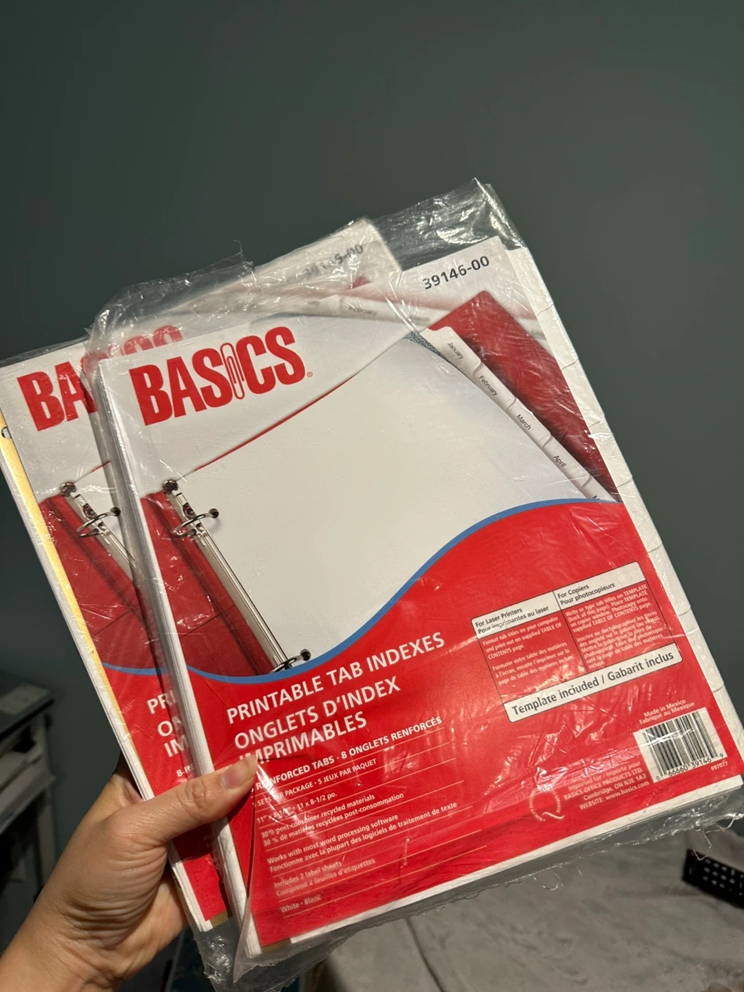 I'm selling a brand new package of Basics Printable Tab Indexes! They are reinforced and ready to help you organize your documents. Each set includes 5 tab dividers for 11" x 8-1/2" paper. They work with most word processing software and include 2 label sheets