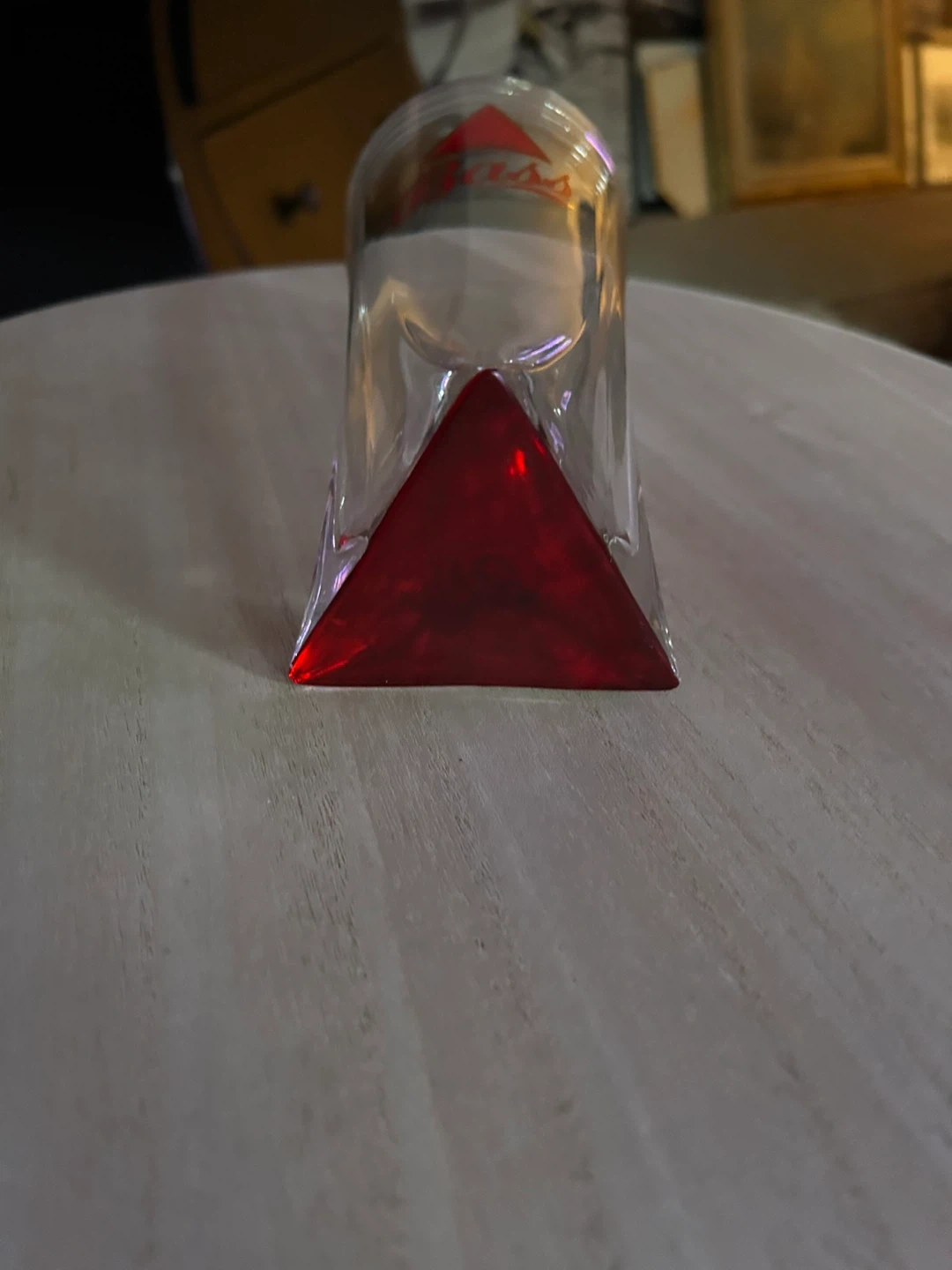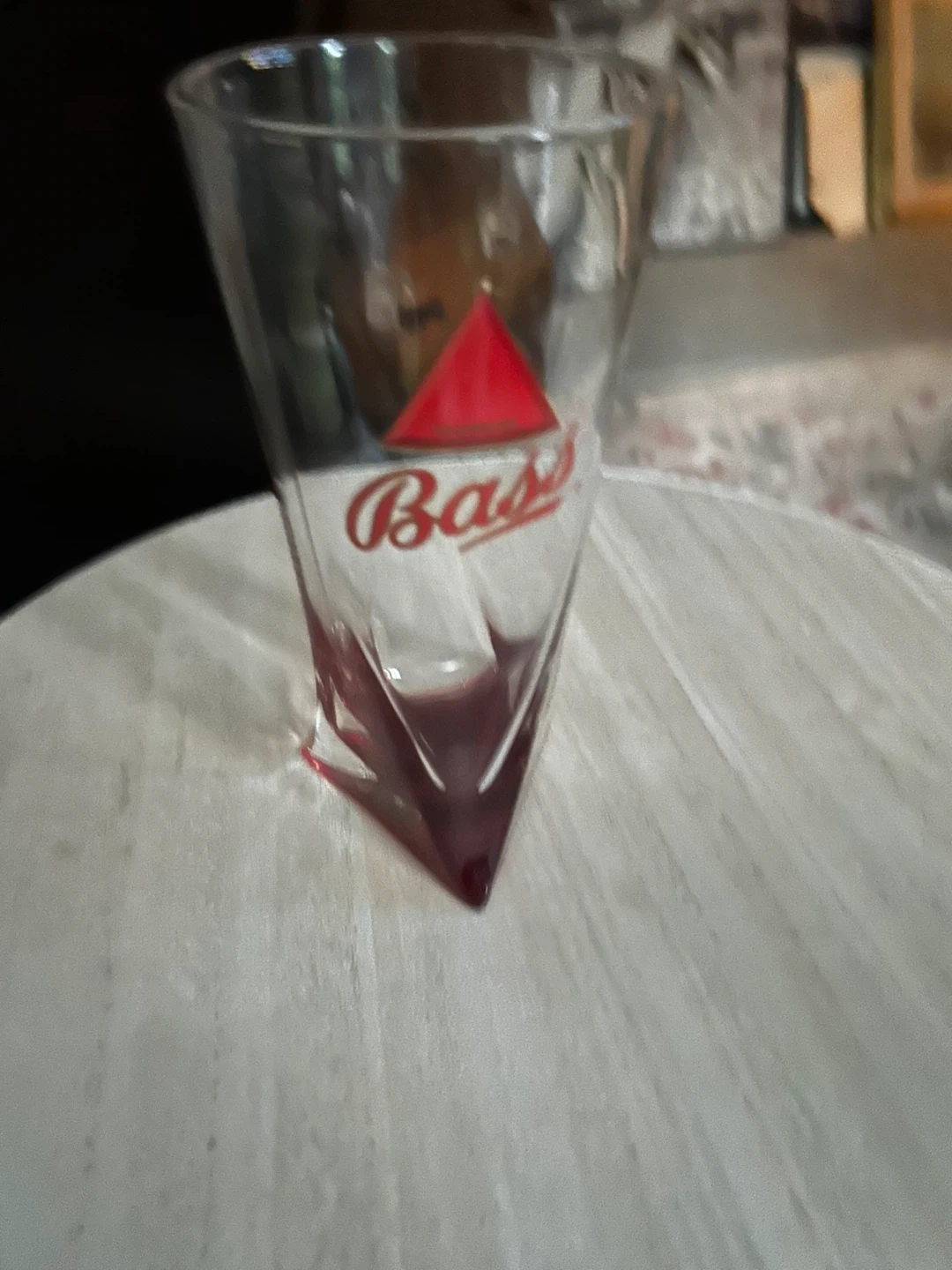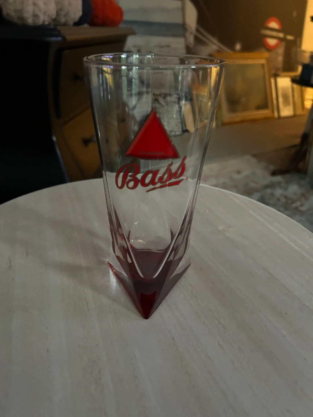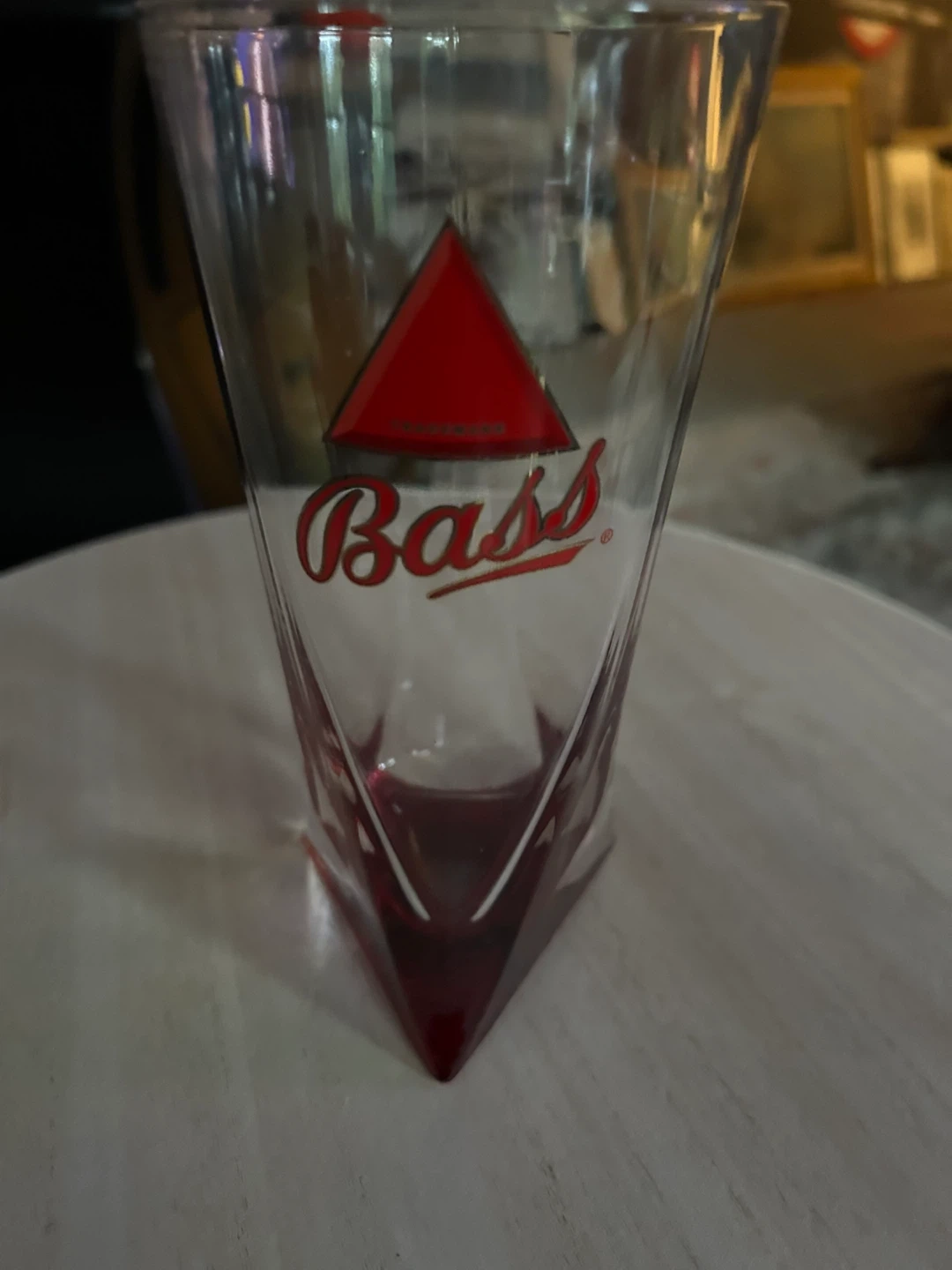Selling a Bass Ale glass. It has a red triangle and the Bass logo printed on the side. Perfect for any beer enthusiast!