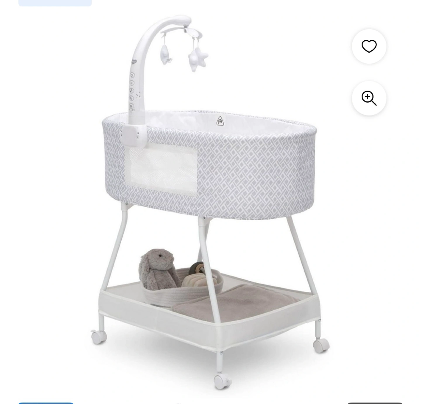 Help your baby sleep better with the Sweet Slumber Bassinet by Delta Children! The attached electronic mobile features spinning toys, a soft-glow nightlight, soothing sounds, vibrations and twinkle lights—everything you and your newborn need. A breathable mesh window on the side increases airflow and provides a clear view of your sleeping baby. Use it anywhere in the house you need a cozy, safe sleep space for your little one, including your bedroom or living room, its wheels make it easy to move from room to room. A generously sized storage basket underneath the frame makes it easy to access all of your baby essentials, and the removable fitted sheet is machine washable for easy care. This bassinet is recommended for babies 0-5 months. Stop use at 5 months or once your infant begins to push up on their hands and knees, whichever comes first.