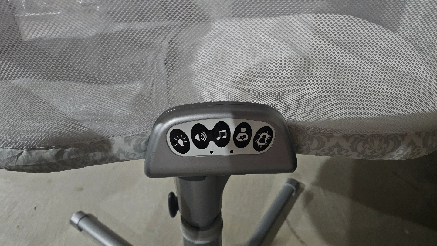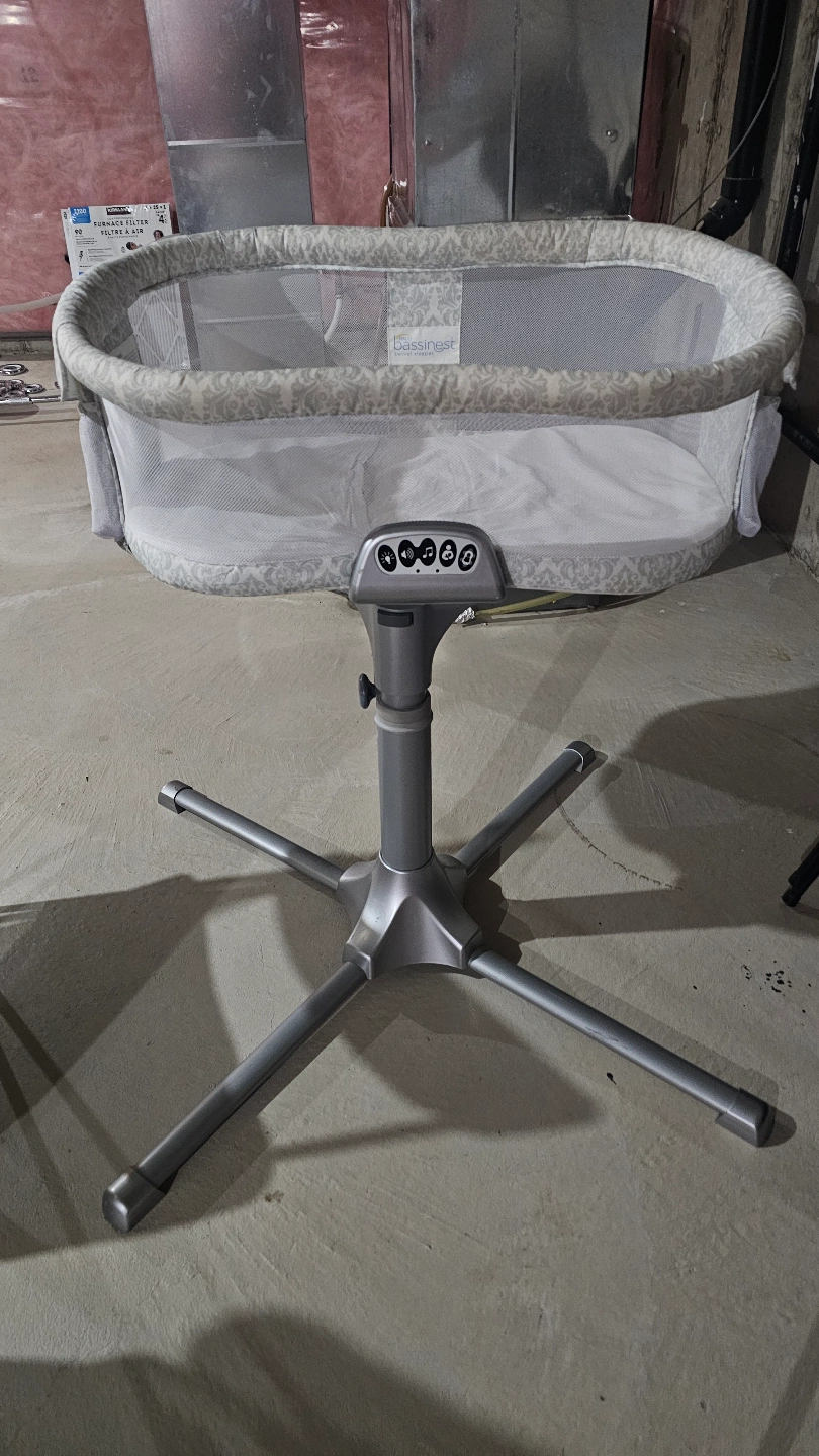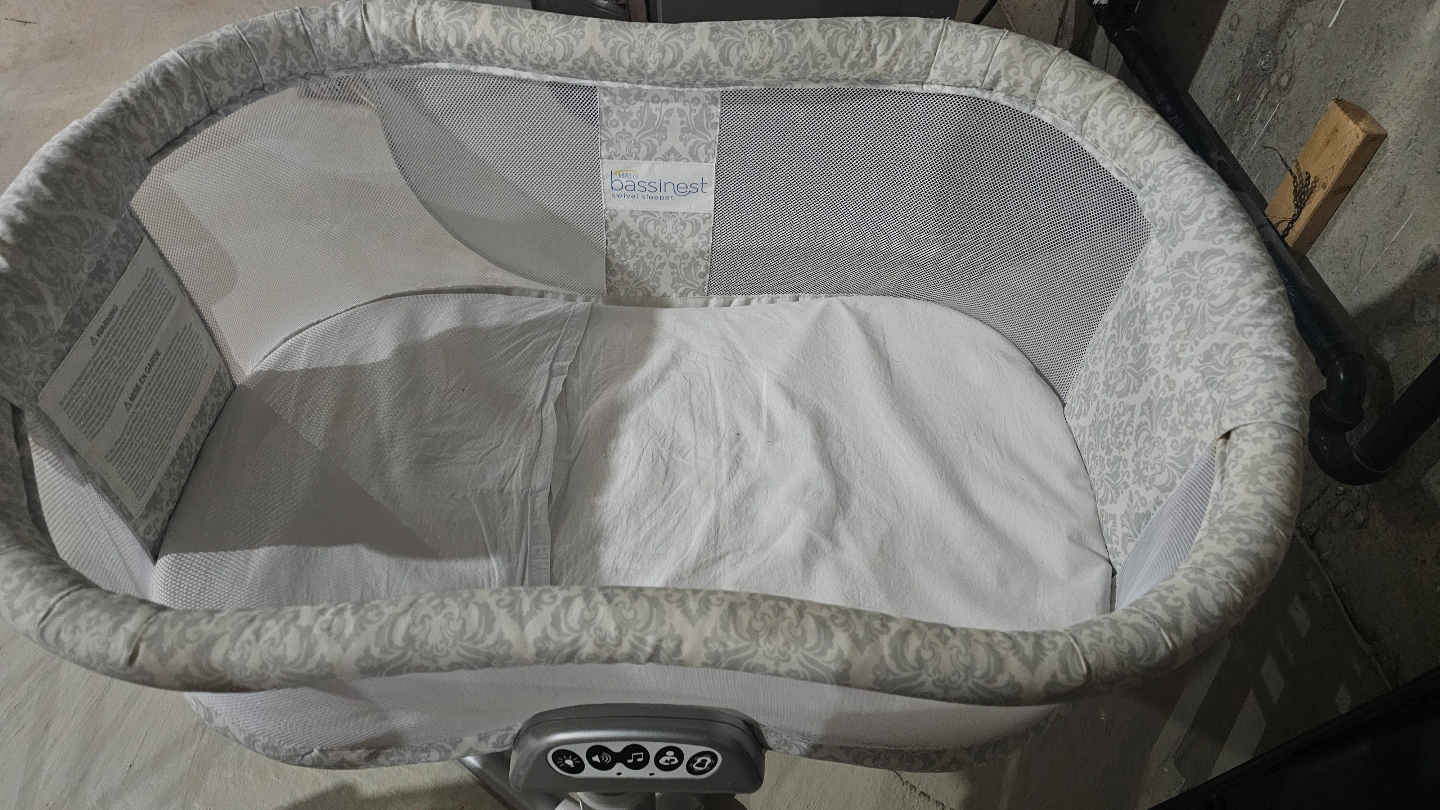 Baby bassinet, grey and white patterned fabric. Features a stand, vibration, and sounds. Good used condition.