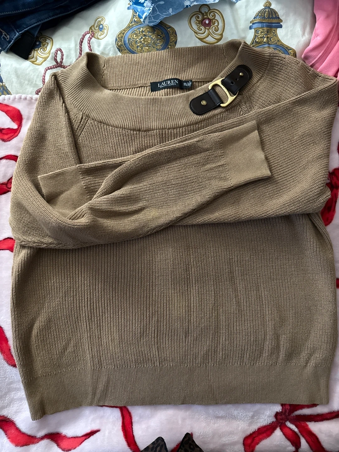 Selling a Ralph Lauren sweater in a beautiful tan color! It features a stylish buckle detail near the neckline. This sweater is perfect for adding a touch of elegance to any outfit