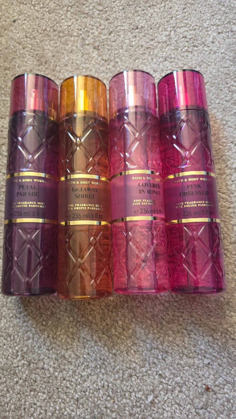 10Selling a set of Bath & Body Works fine fragrance mists! Includes Petal Parade, Getaway Soiree, Covered in Roses, and Pink Obsessed. Each bottle contains 236ml/8 fl oz ($10/item)
