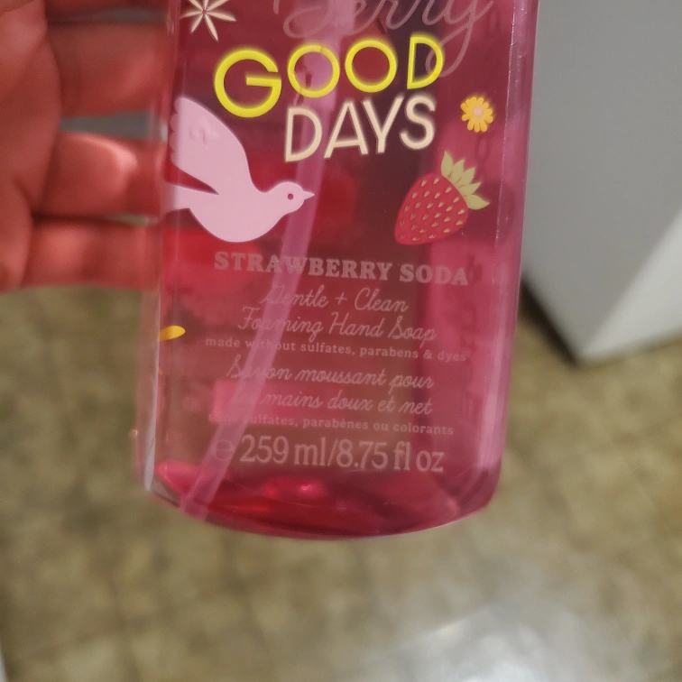 63Selling a bottle of Bath & Body Works Very Berry Good Days Strawberry Soda gentle + clean foaming hand soap. It's made without sulfates, parabens & dyes. The bottle contains 259 ml / 8.75 fl oz. Barely used. Doesn't work with my skin.