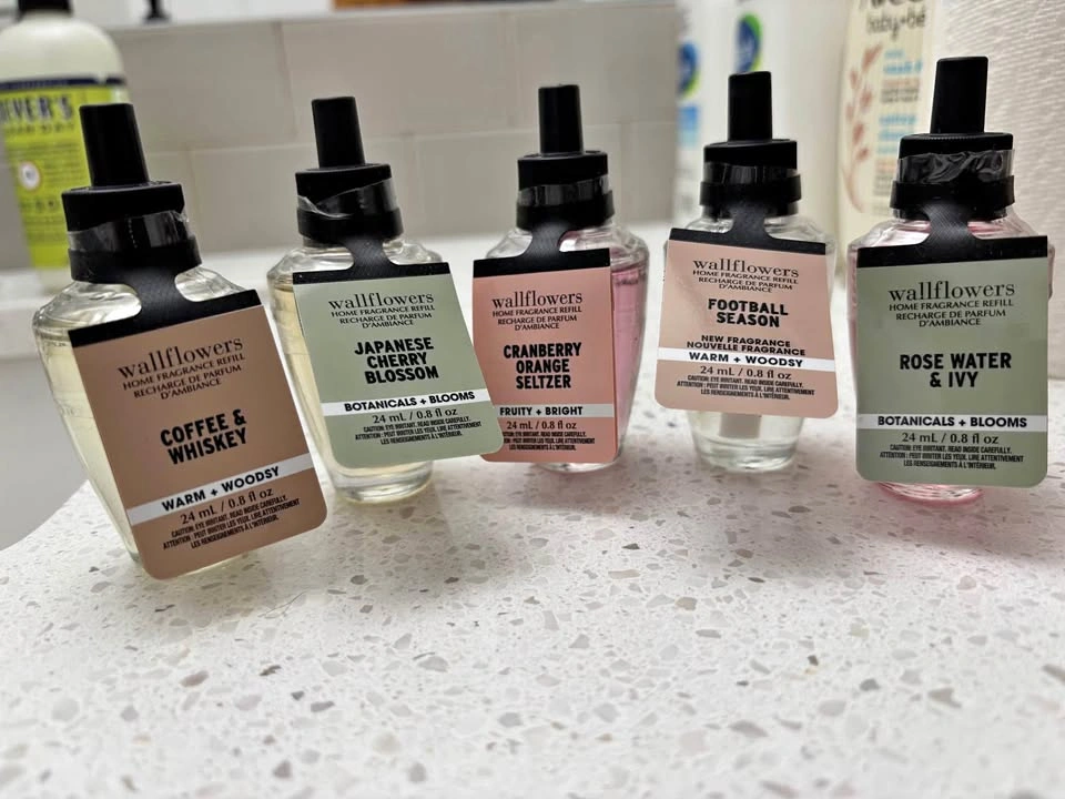 65Freshen up your home with these popular scents: • Coffee & Whiskey ☕ • Japanese Cherry Blossom 🌸 • Cranberry Orange Seltzer 🍊 • Football Season 🏈 • Rose Water & Ivy 🌹 Each bottle 24 ml, unopened and authentic. Perfect for any Wallflower plug. 📍Pickup in Homestead NE.