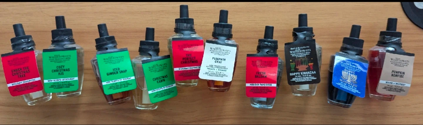 50Selling a variety of Wallflowers home fragrance refills! Scents and amount of refills include: Under the Christmas Tree (13) Cozy Christmas PJs (2) Iced Ginger Snap (4) Christmas Cabin (4) The Perfect Christmas (1) Fresh Balsam (2) Happy Kwanzaa (3) Hannukah (3) Pumpkin Bonfire (3) All are 24 ml / 0.8 fl oz Originally $8.95 Each Now $2.00 Each CASH ONLY