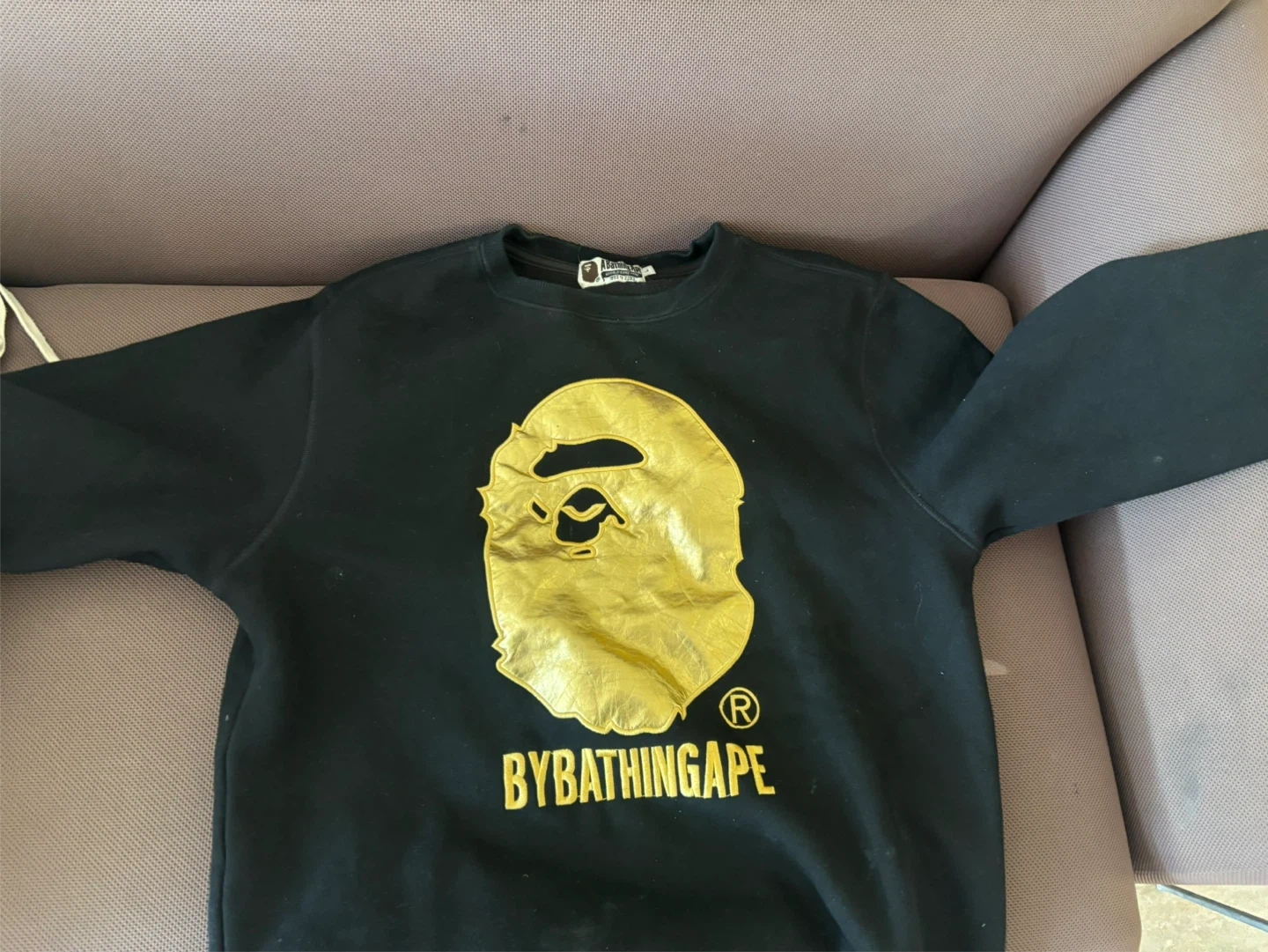 Selling a black crewneck sweater from Bathing Ape (BAPE). It features the iconic BAPE head logo in gold on the front. A stylish and comfortable piece for any streetwear enthusiast! Size L