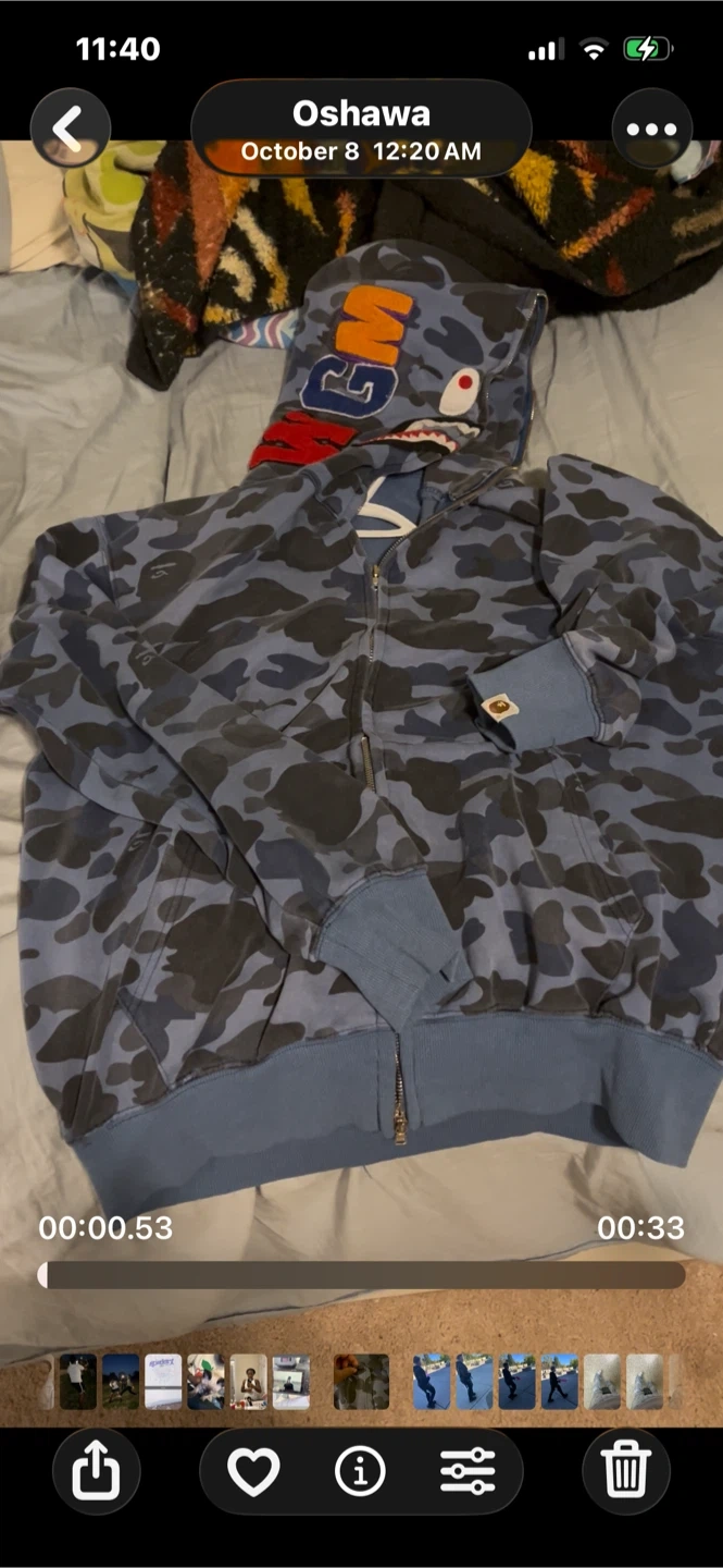 20NOT 500 I can’t change it ‘’ Selling a Bathing Ape (BAPE) full zip hoodie in a cool blue camo pattern. It's got the iconic shark design on the hood. This hoodie is perfect for adding a bit of streetwear style to your wardrobe!