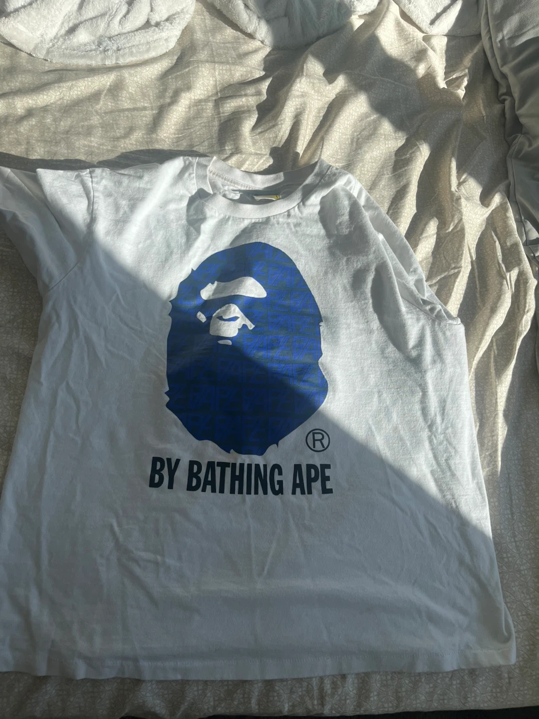 Selling a Bathing Ape (BAPE) t-shirt in white. It's a size L and features the iconic BAPE logo. Please see photos for condition! Pickup or delivery Good condition