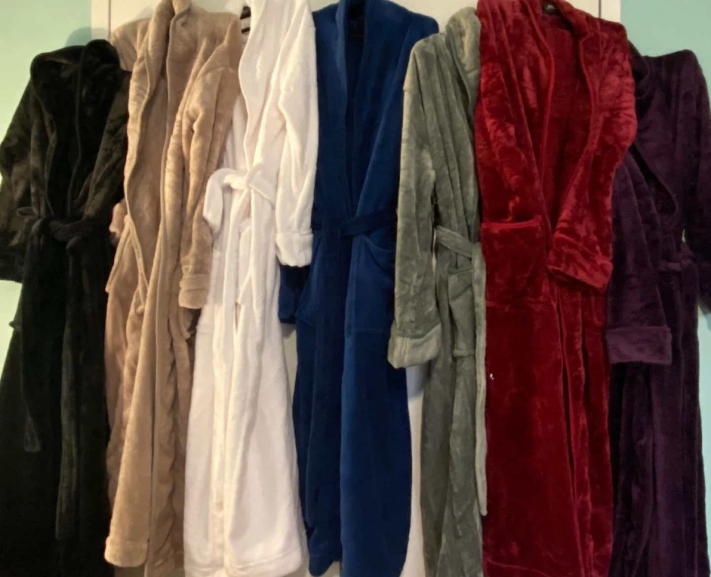 361 for 15$ or 3 for 35$ Cozy up with these plush robes from Utopia Towels! Available in a range of colours and sizes. They're made from 100% polyester and are super soft. Perfect for lounging around the house!