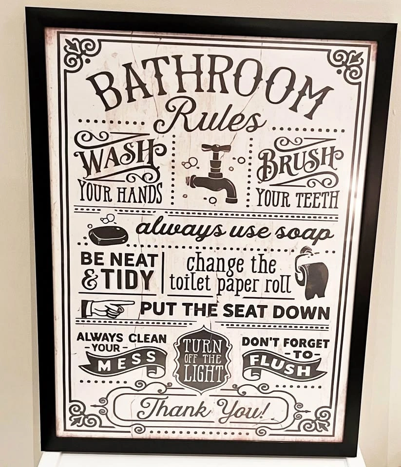 10Add a little charm and humor to your bathroom! • Size: 12” x 16” • Black frame with clear plastic front (lightweight and shatter-safe) • Neutral beige/black design suits any décor 📍 Pick up in North Ajax