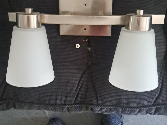 Selling a bathroom vanity light fixture with two frosted glass shades. It has a brushed nickel finish. Perfect for a bathroom upgrade!