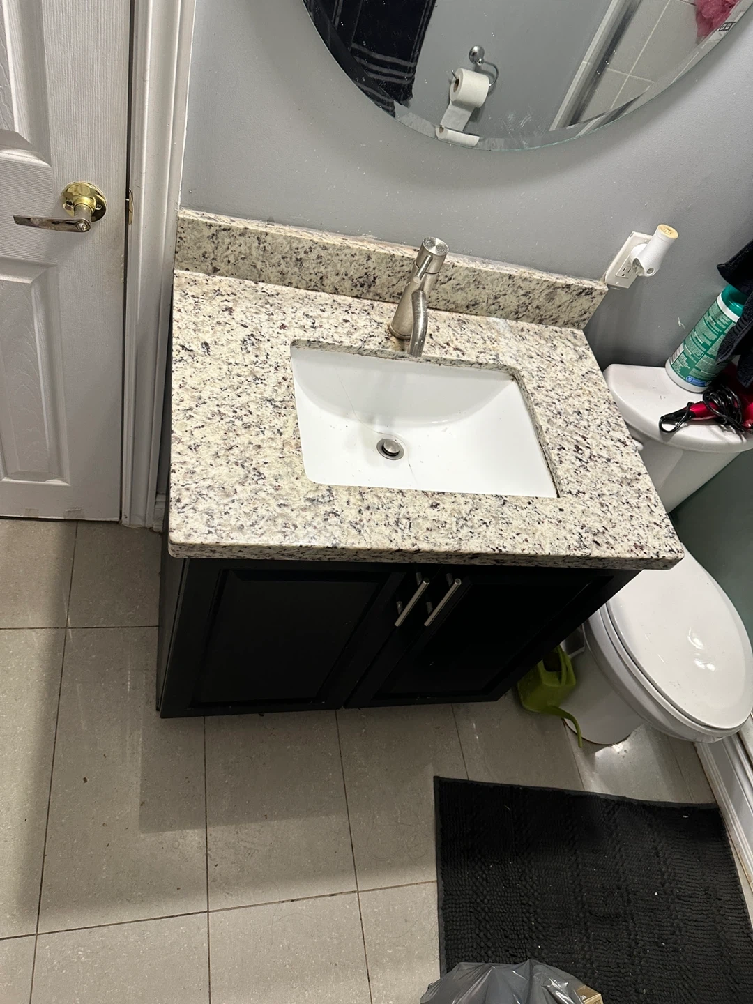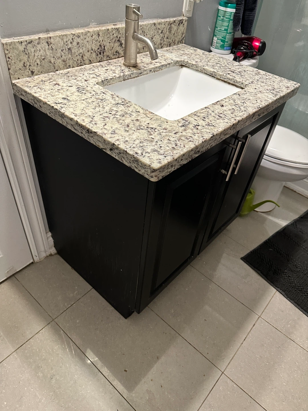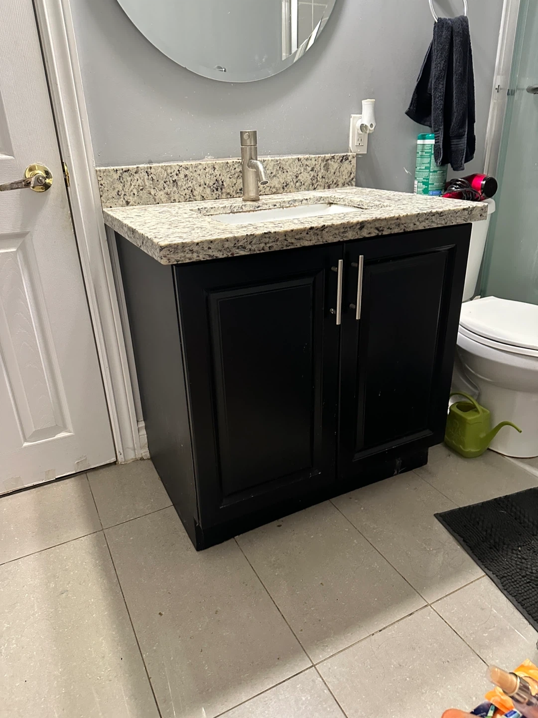 16Selling a beautiful bathroom vanity cabinet with a real granite countertop and backsplash. The sink cracked during removal, so this listing is for the vanity cabinet + granite top only — perfect if you already have a sink basin or plan to install your own. Details: • Sturdy cabinet with solid wood doors (black finish) • Genuine granite countertop with backsplash included • Modern faucet included (optional – works perfectly) • Standard size: approx. 30” wide × 22” deep × 32” tall • Great for bathroom remodels, rental units, or basement washrooms