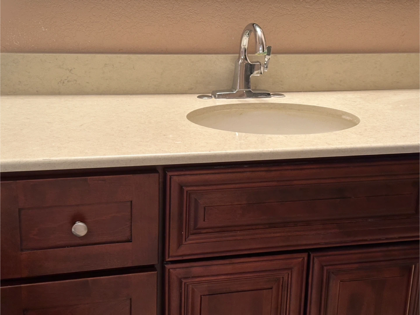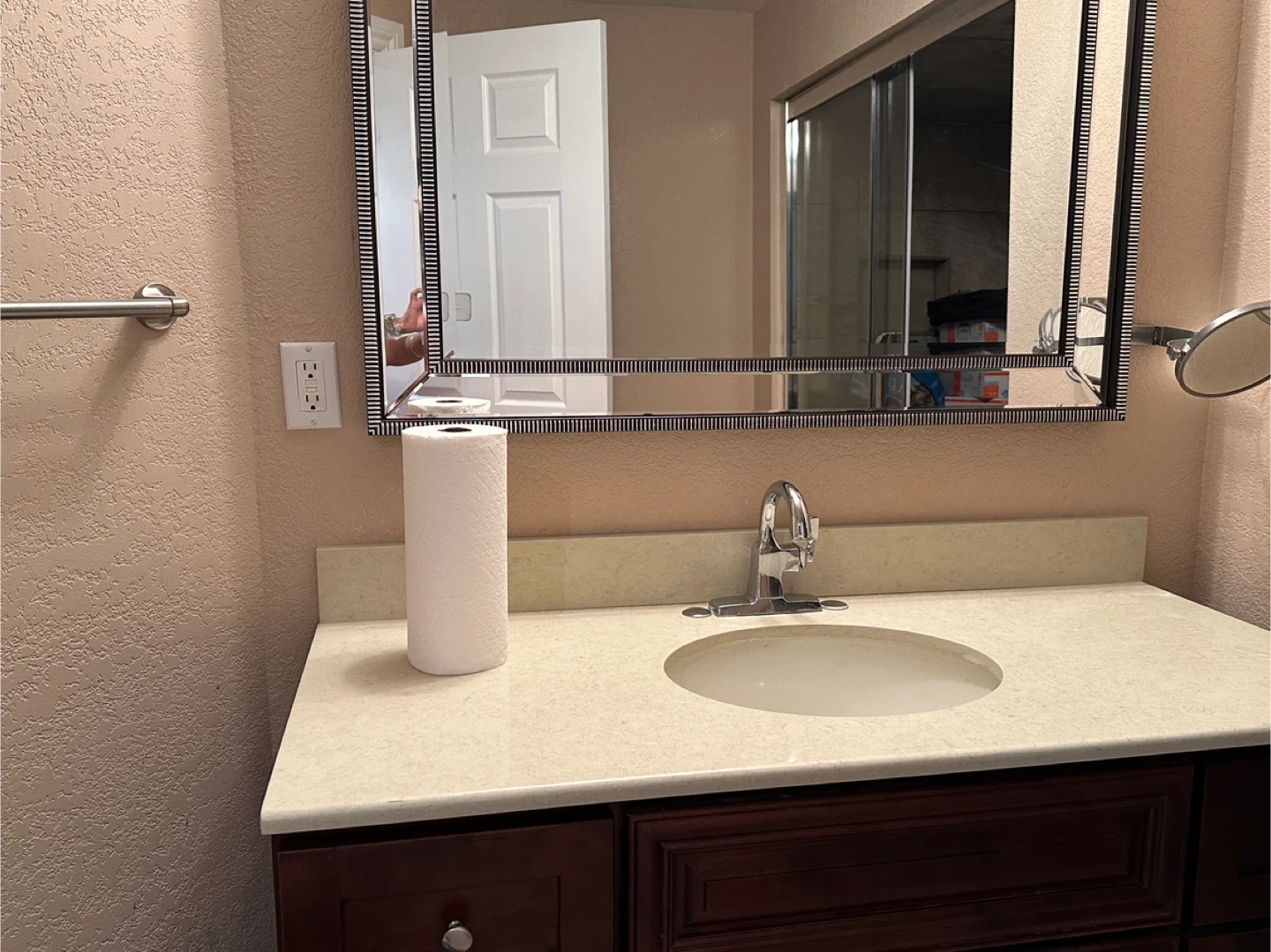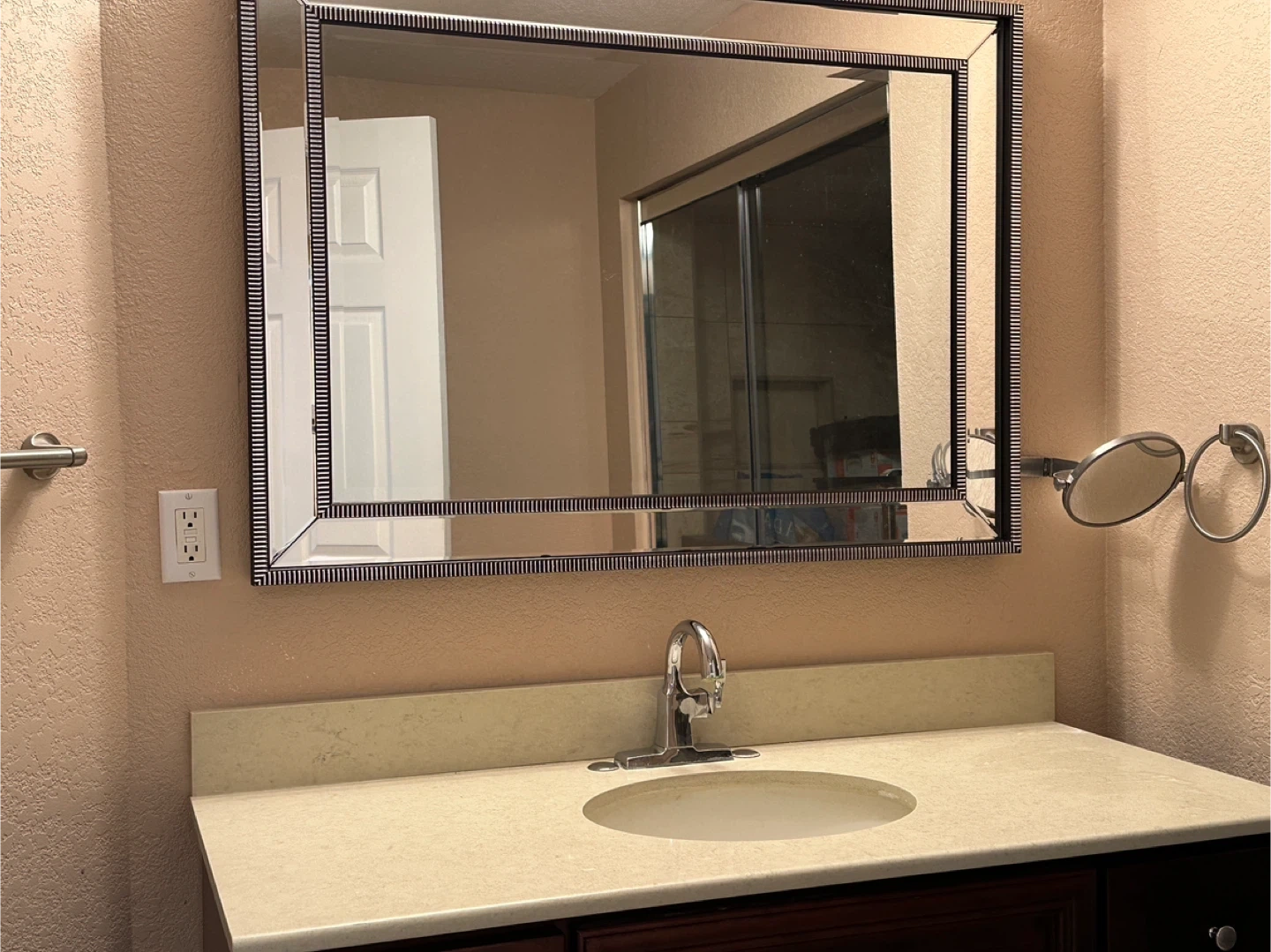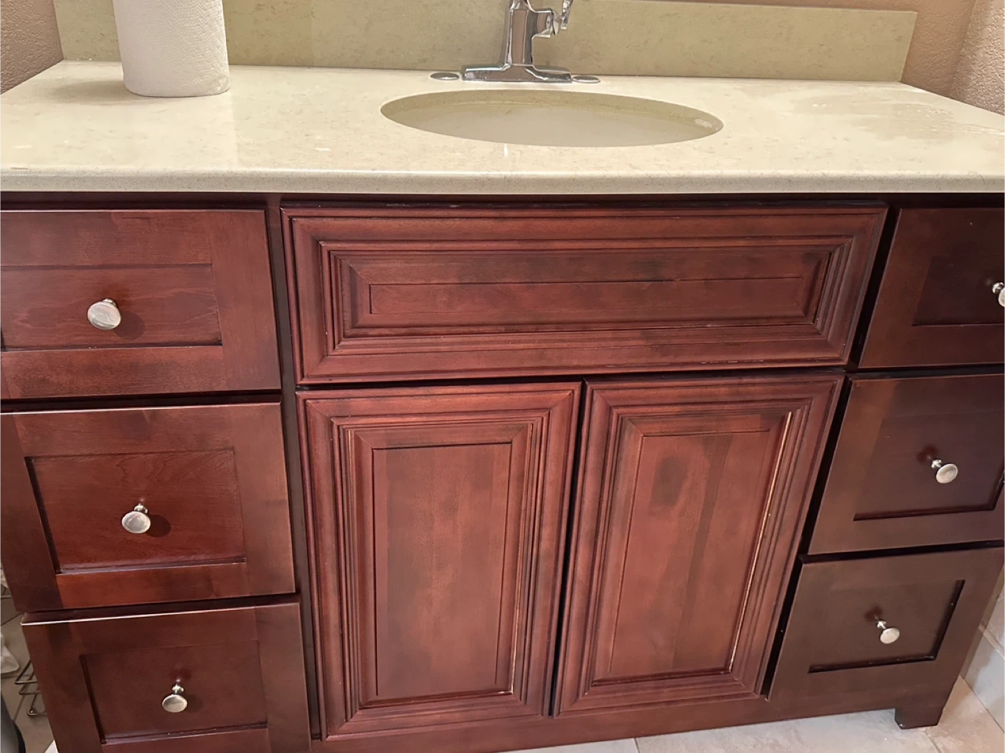 Selling a bathroom vanity complete with a sink and a matching mirror. The vanity features a dark wood finish and offers ample storage space with drawers and cabinets. The countertop is a light neutral colour. The mirror has a decorative frame that complements the vanity's style. Perfect for a bathroom renovation or upgrade!