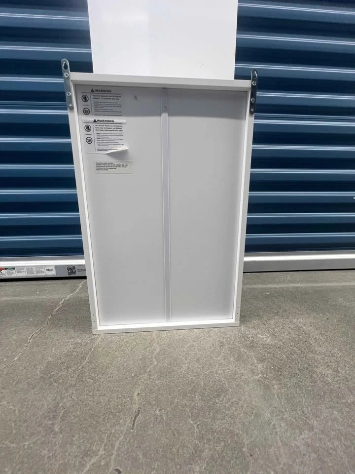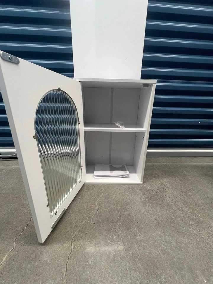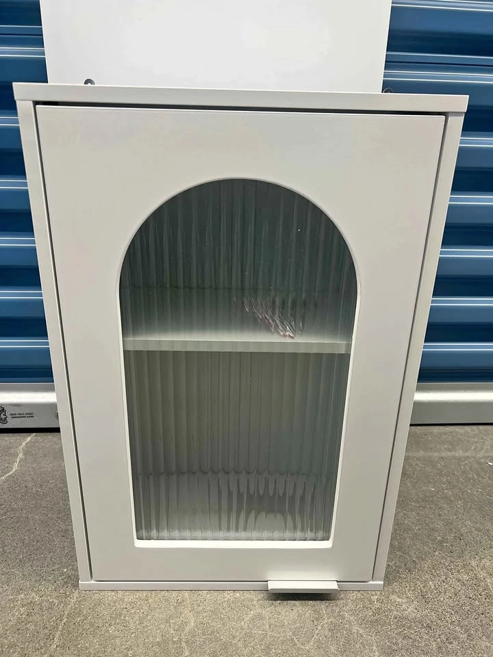 49Elegant white wall-mounted cabinet with a tempered glass door and 3-position adjustable shelf. Perfect for organizing bathroom essentials, skincare, or toiletries while saving floor space. Durable MDF construction, smooth finish, and includes wall-mounting hardware. Brand new, pulled from a liquidation pallet. Dimensions: 21” H × 14” W × 8” D