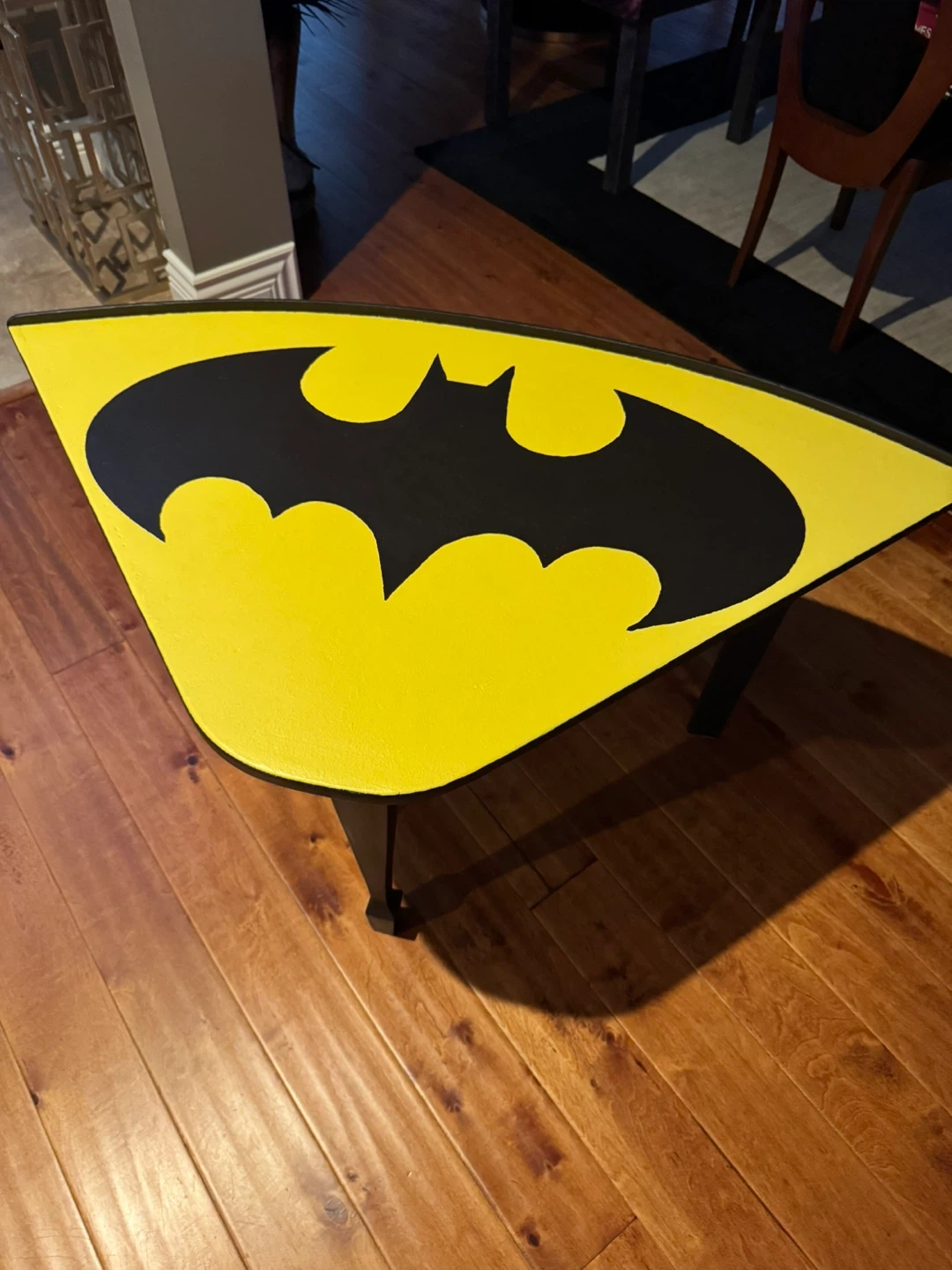 Selling a fun and unique side table featuring the iconic Batman logo! The table has a bright yellow surface with a bold black Batman symbol. It's perfect for a kid's room or any Batman enthusiast looking to add a bit of character to their space