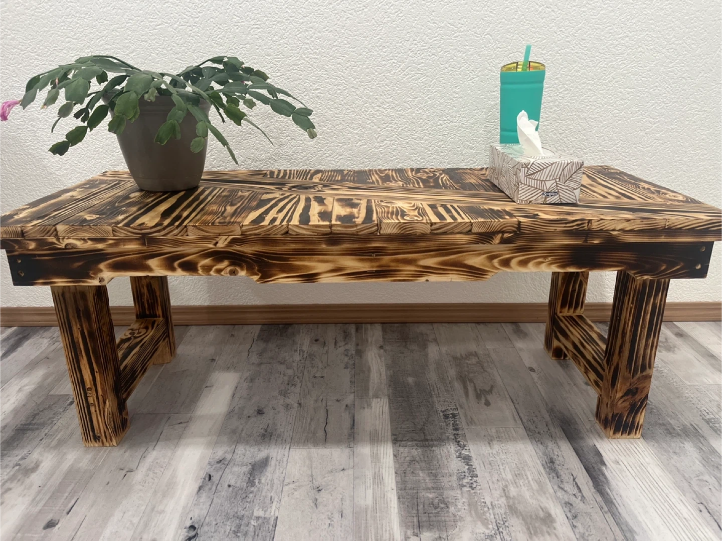 Rustic wood coffee table or bench with a burnt wood finish. It's constructed from solid wood with a distinctive grain pattern. This piece would work well as a low table or a casual bench.