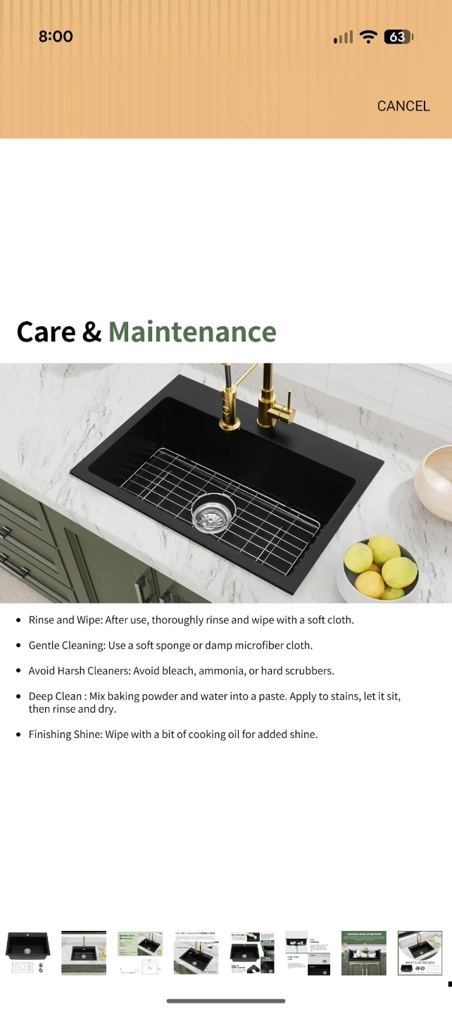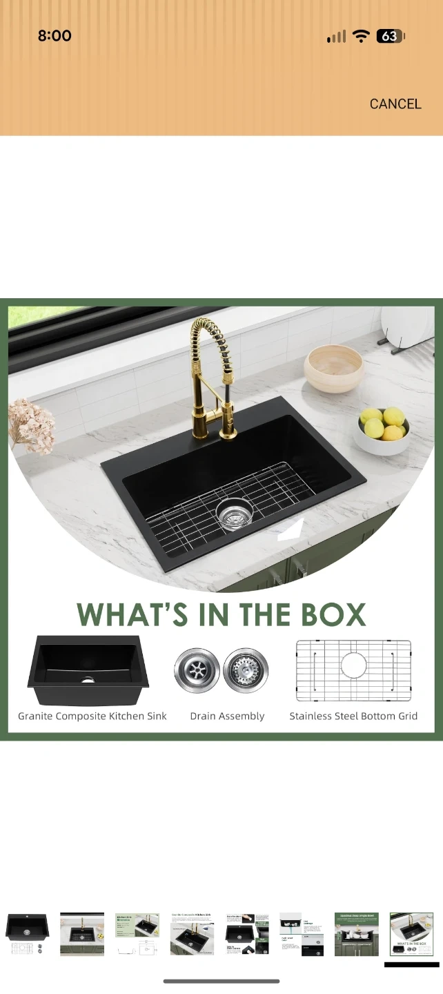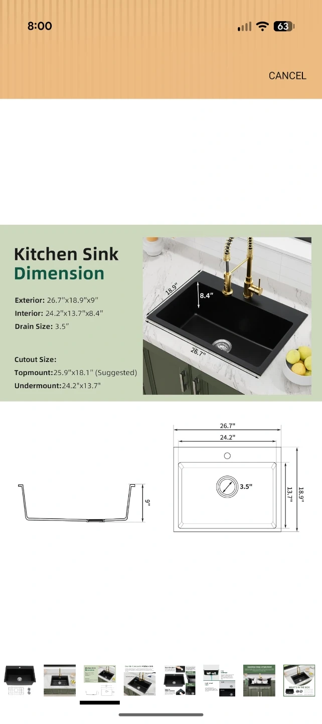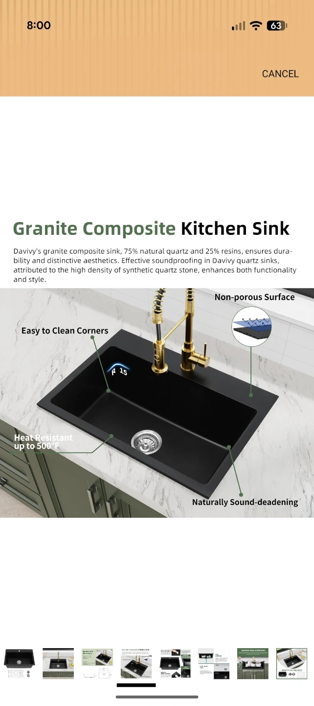 This is a Davivy granite composite kitchen sink. It's stain resistant, heat resistant up to 500°F, and naturally sound-deadening. The sink is 26.7" x 18.9" exterior dimensions and includes a bottom grid and drain assembly. This sink would be great for a busy kitchen needing easy cleanup and durability.