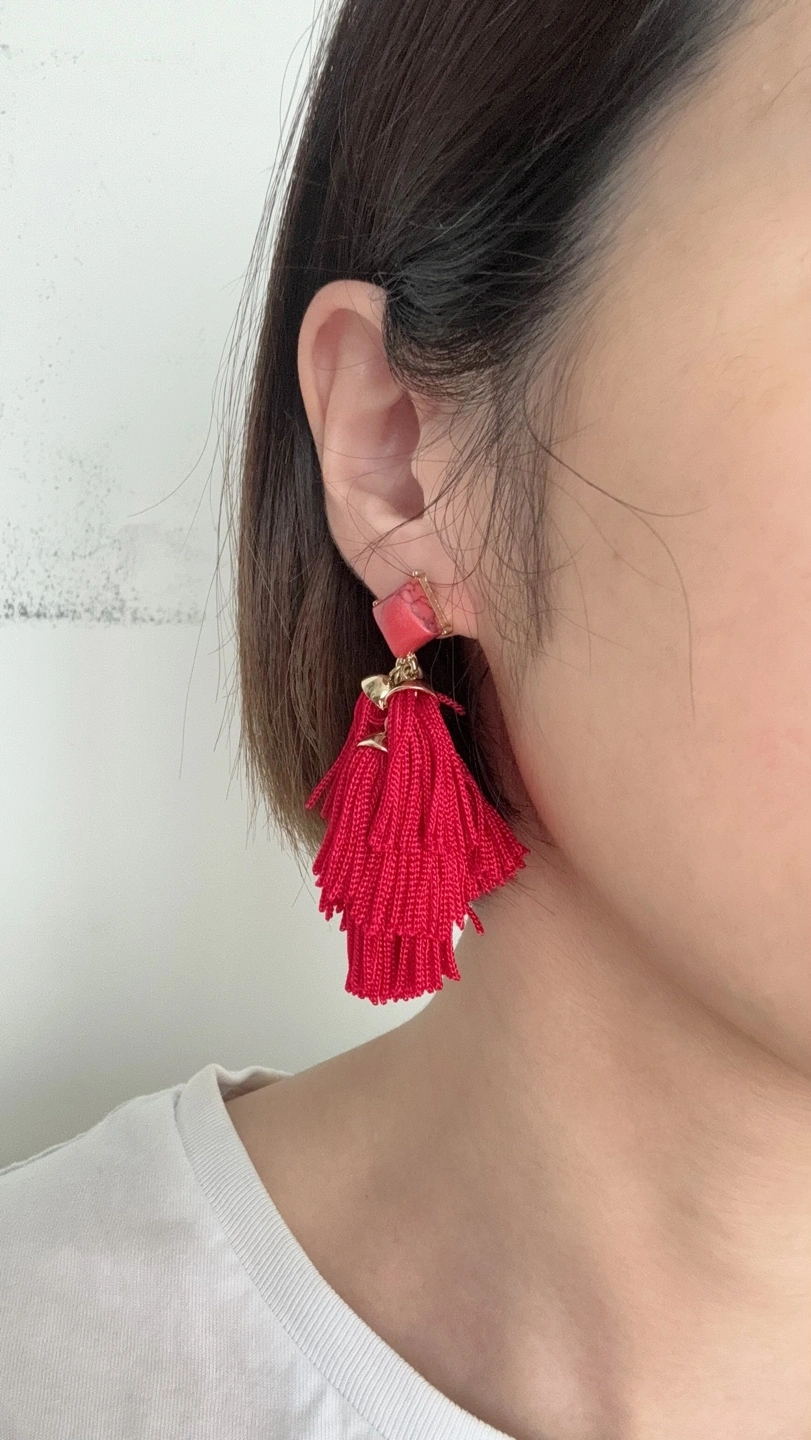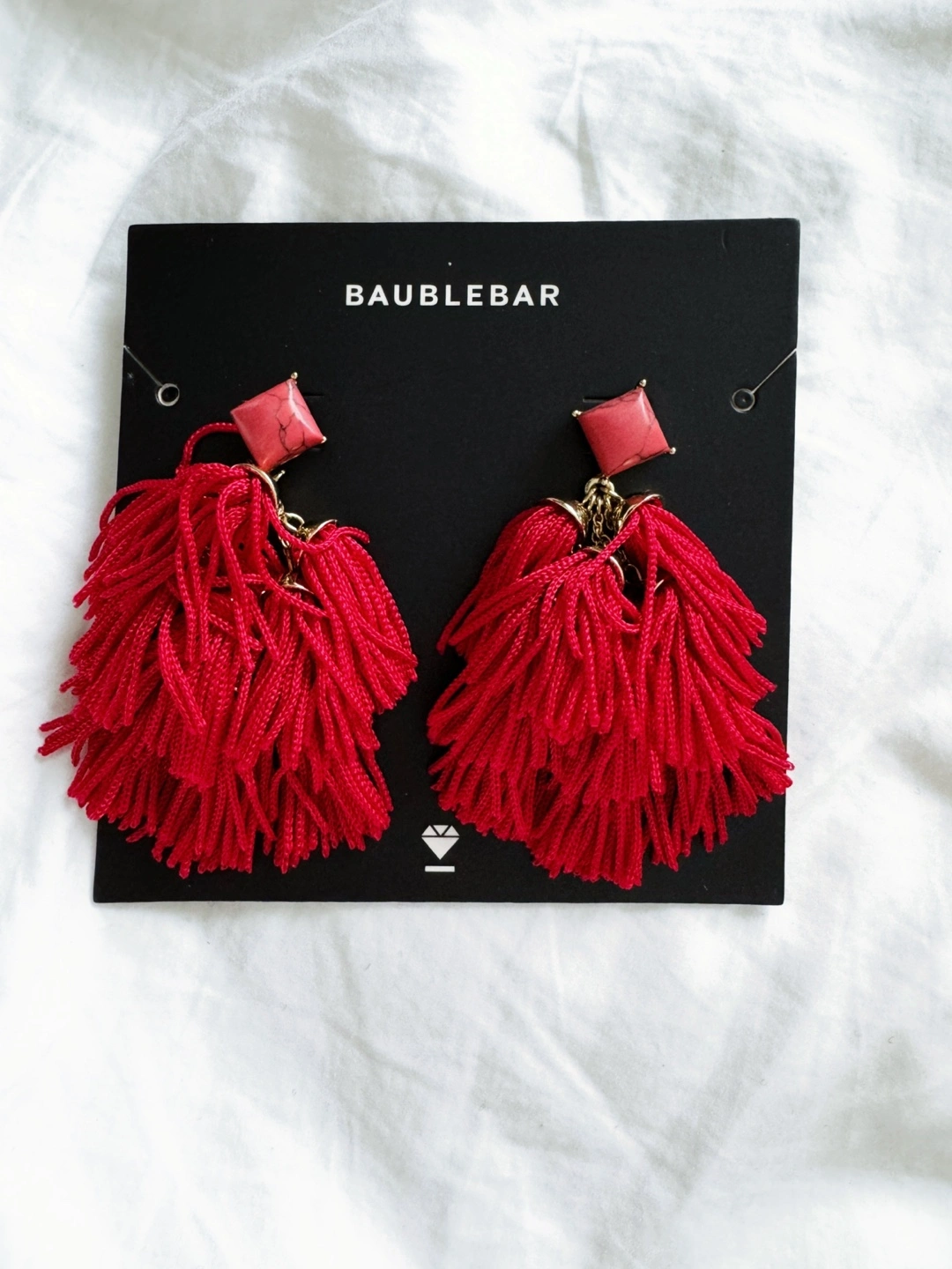 57Gorgeous red tassel earrings. Layered design. Pink stone accents. Gold-tone hardware. Excellent statement earrings.